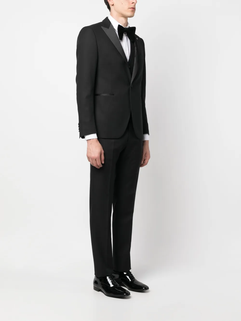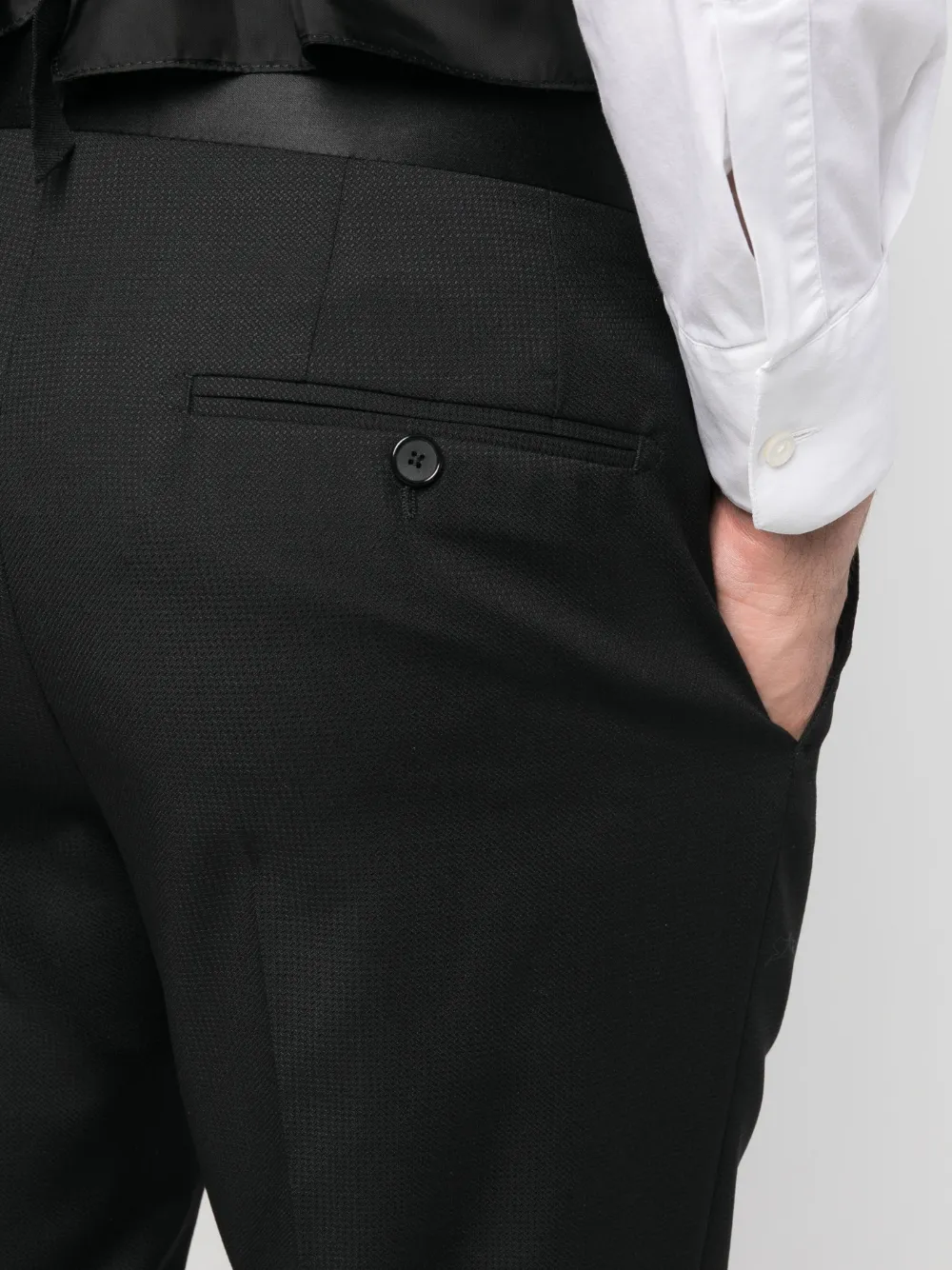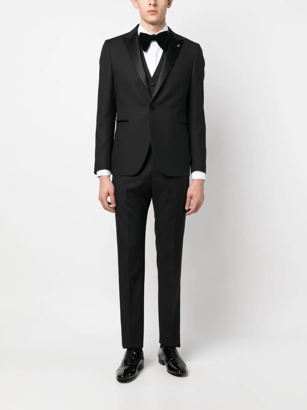 Черный, смесь необработанной шерсти и шелка, подвеска с логотипом, заостренные лацканы, шлица по центру сзади, застежка на пуговицах спереди, прорезной карман на груди, два передних кармана с листочкой, длинные рукава, манжеты на пуговицах, V-образный вырез, застежка на пуговицах спереди, без рукавов, петли для ремня, застежка на молнии и пуговице спереди, два прорезных кармана по бокам, два прорезных кармана на пуговицах сзади и узкий крой.