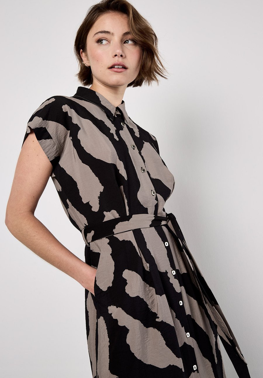 Откройте для себя мир миди с этим платьем с зебровым принтом. Платье с воротником и короткими рукавами, застежкой на пуговицы спереди, боковыми карманами и тканевым поясом создает привлекательный и удобный силуэт. Воротник: Отложной воротникМатериал и уход