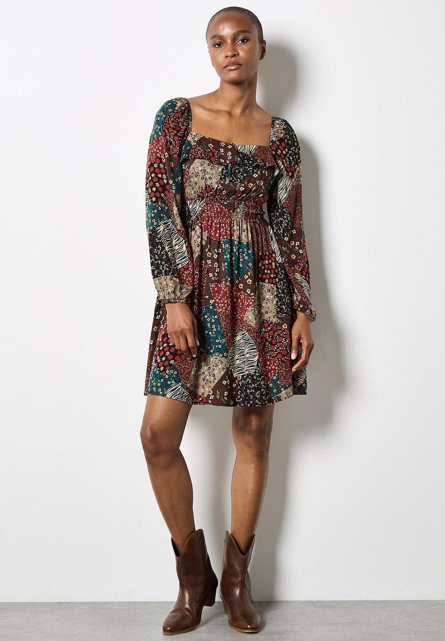 Это мини-платье в стиле пэчворк, сочетающее женственные цветочные принты с ярким принтом под зебру, идеально подойдет для всех ваших повседневных дней. Легкое и тканое платье с вырезом сердечко и оборками, рукавами-фонариками и присборенной талией создает привлекательный силуэт. Вырез: КвадратныйМатериал и уход