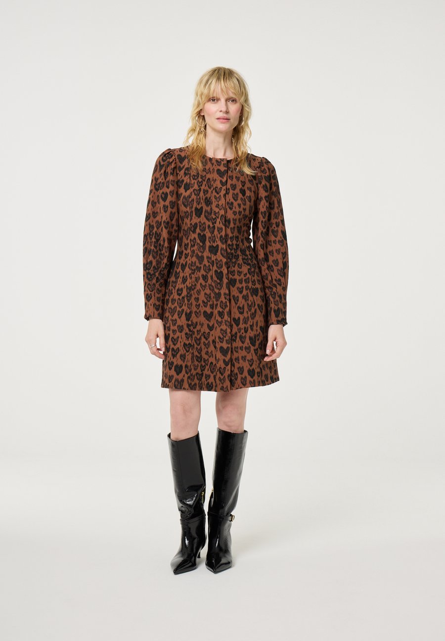 Это короткое платье с темно-коричневым леопардовым принтом и струящимся силуэтом создает непринужденно женственный образ. Слегка пышные рукава и складки добавляют движению и текстуре силуэту. Универсальная вещь, которую легко сочетать как с повседневной, так и с нарядной одеждой. Вырез горловины: круглый.Материал и уход