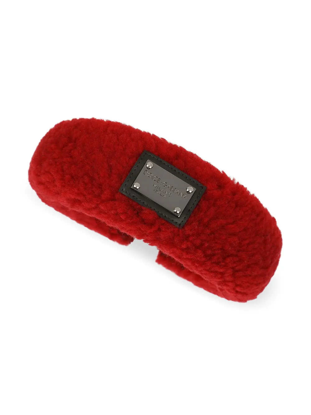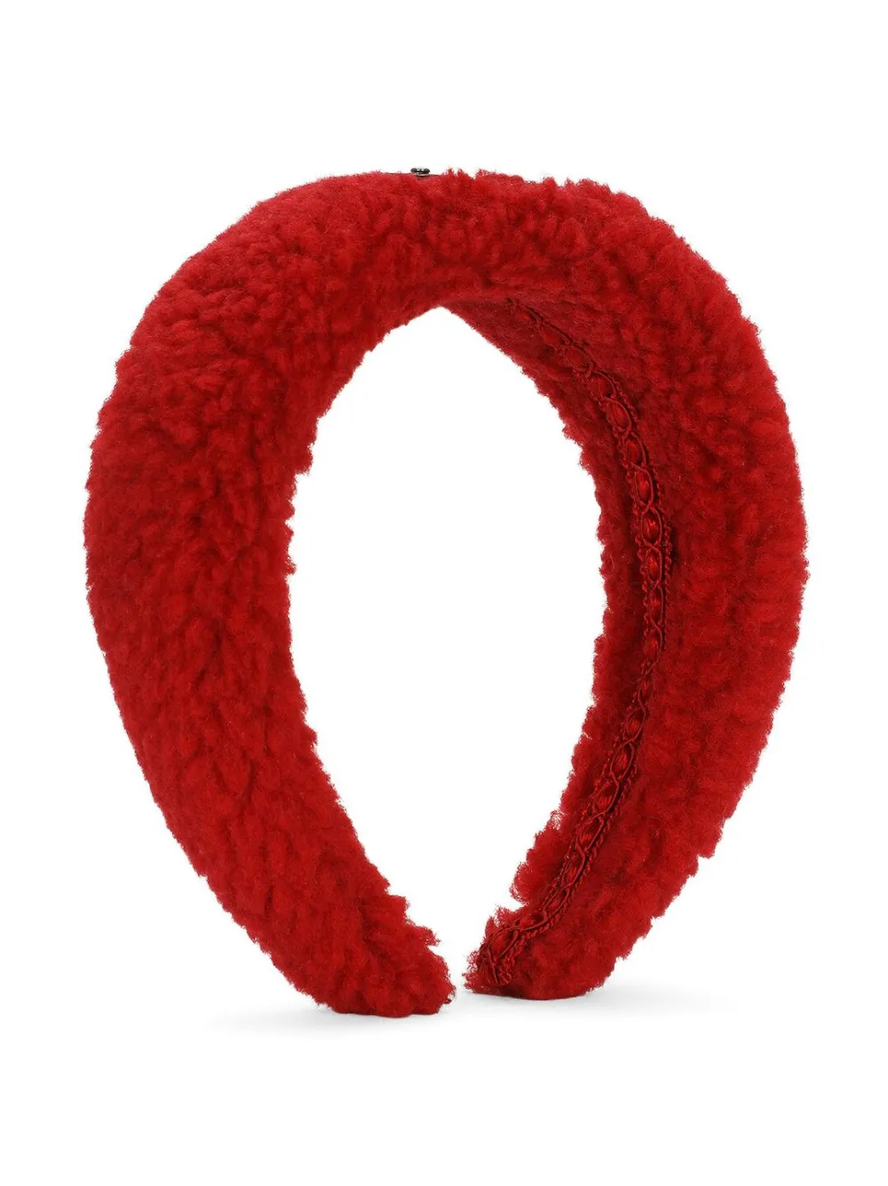 Красный, искусственный мех, серебристый металлический логотип, прямые наконечники дужек и модель без застежки.