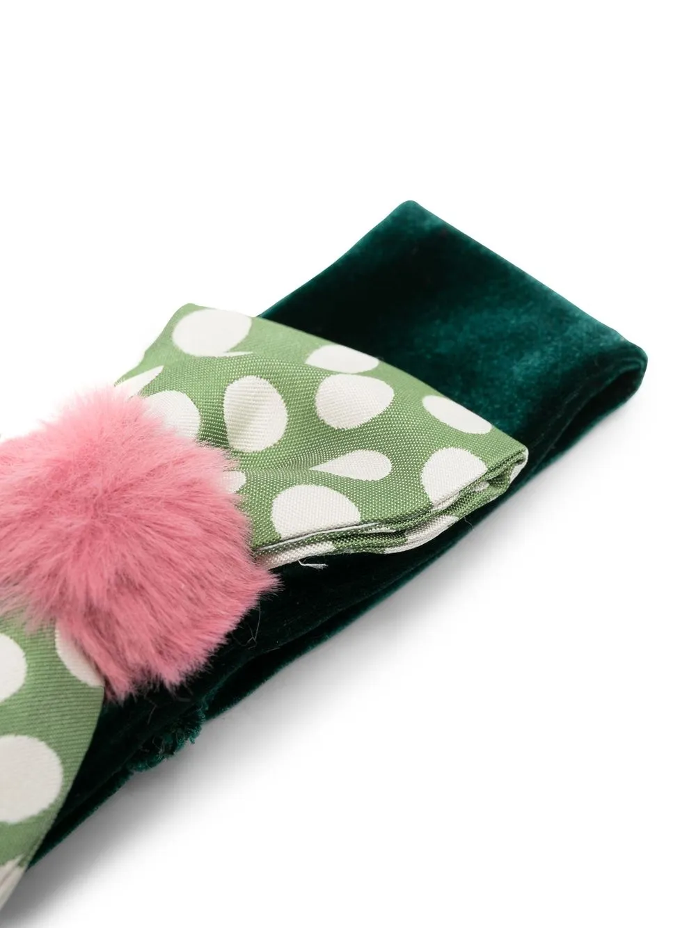 Насыщенный зеленый, эластичный материал, бархатистое покрытие, бант, принт в горох, помпоны и эластичный дизайн.