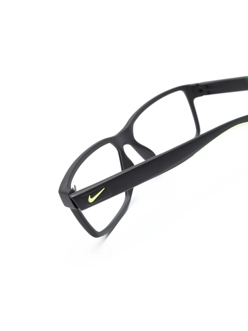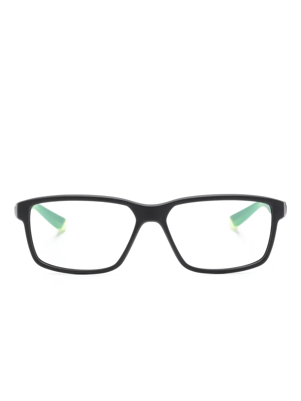 Черный/зеленый, ацетат, прямоугольная оправа, прозрачные линзы, прямые дужки, дужки с закругленными концами и логотип Nike Swoosh. В комплект входит защитный чехол для очков. Обратите внимание, что на FARFETCH продаются оправы с линзами без диоптрий.