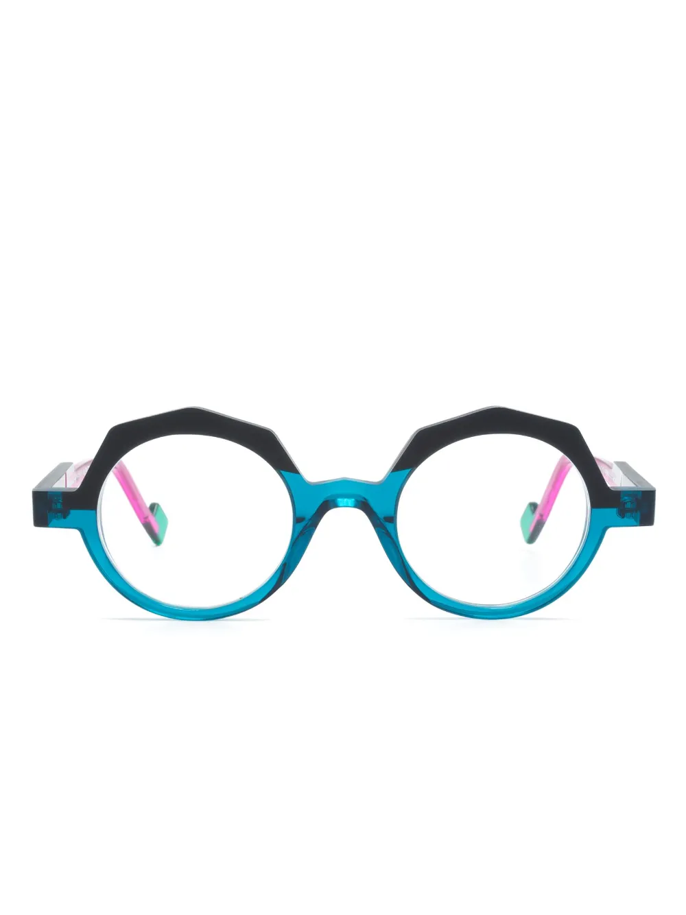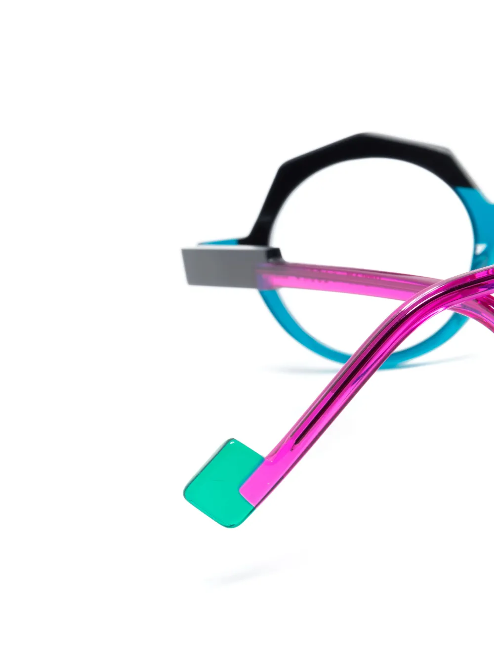 Синий, черный, бледно-розовый, ацетат, прозрачные линзы, круглая оправа, прямые дужки и дужки с закругленными концами. В комплект входит защитный чехол для очков. Обратите внимание, что на FARFETCH продаются оправы с линзами без диоптрий.