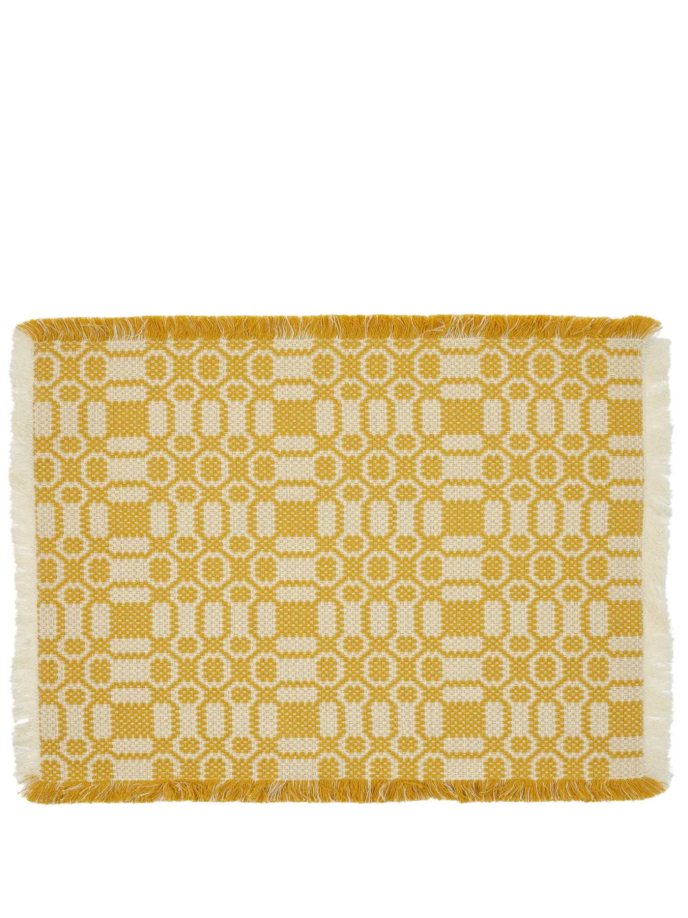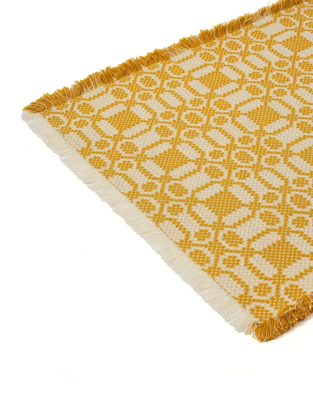 Желтый, хлопок, геометричный узор, прямоугольная форма и необработанные края.