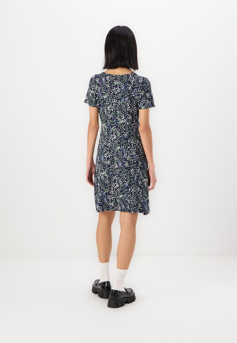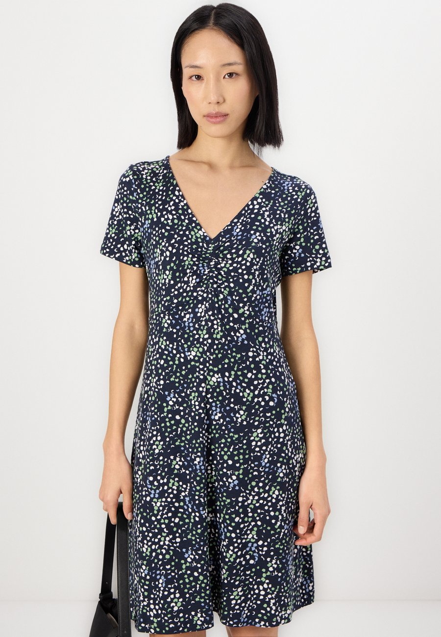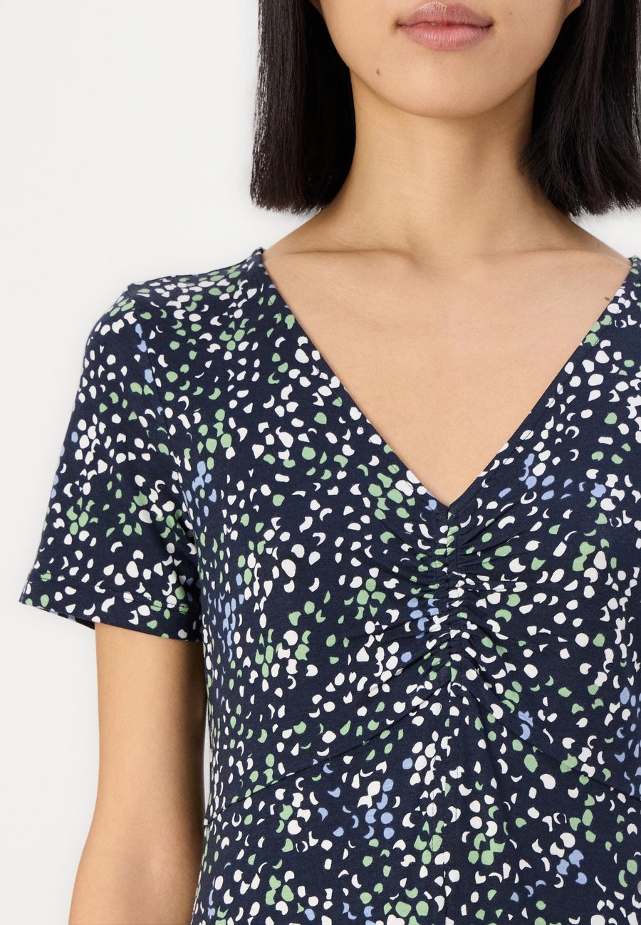 Платье длиной до колена с небольшими оборками. Изготовлено из однослойного трикотажа с небольшим содержанием эластана для комфортной посадки. Вырез горловины: Низкий V-образный вырезМатериал и уход