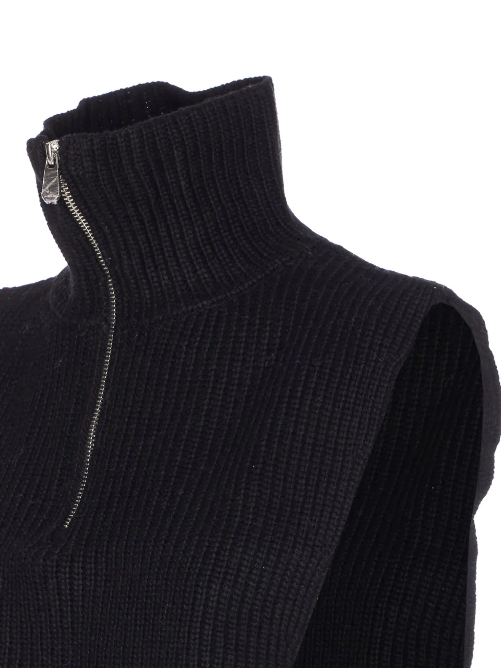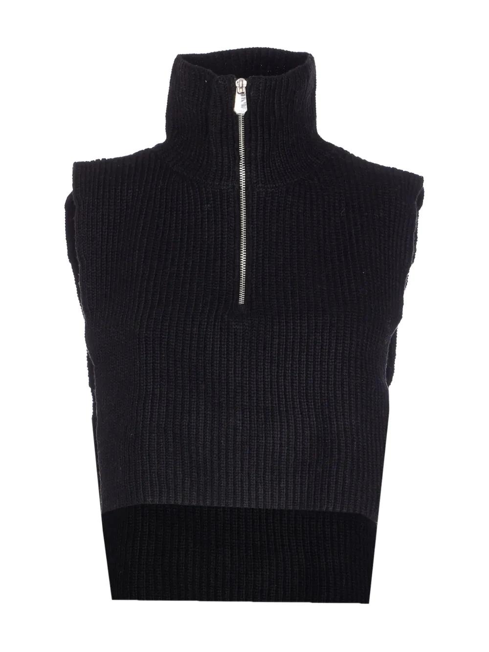 Черный трикотаж в рубчик, высокий воротник на молнии, логотип на спине, без рукавов