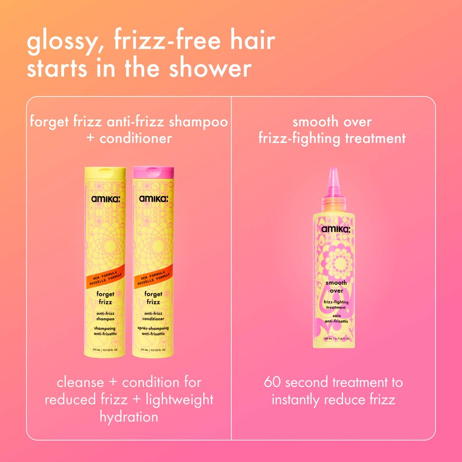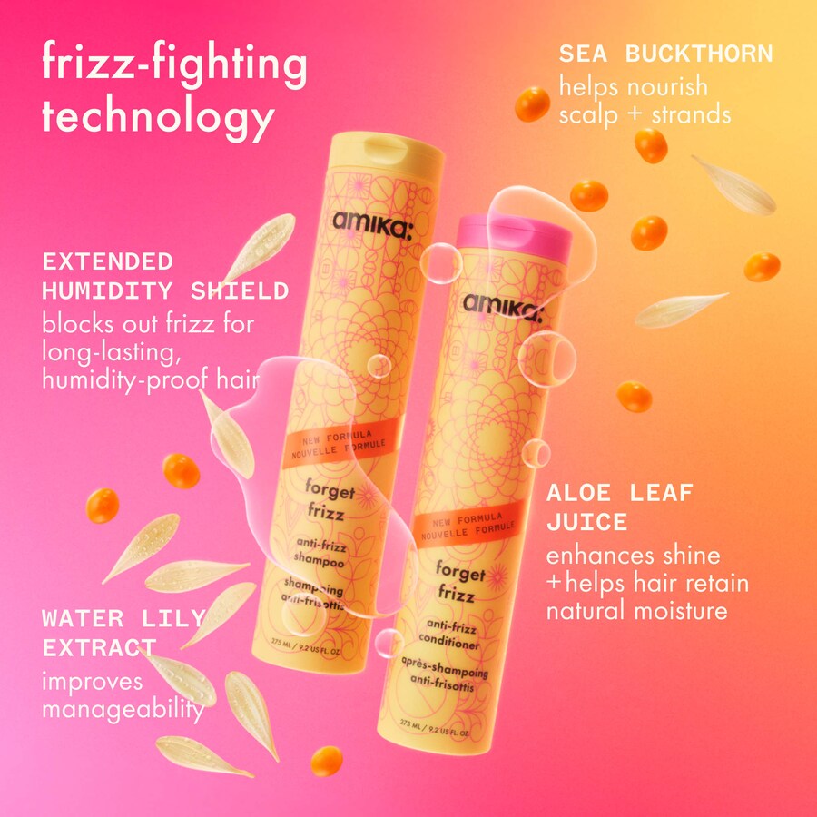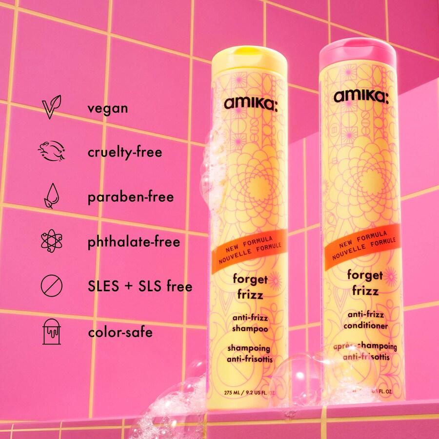 - До 74% меньше пушистости в течение 72 часов при высокой влажности при использовании в сочетании с кондиционером amika Forget Frizz Anti-Frizz (продается отдельно)