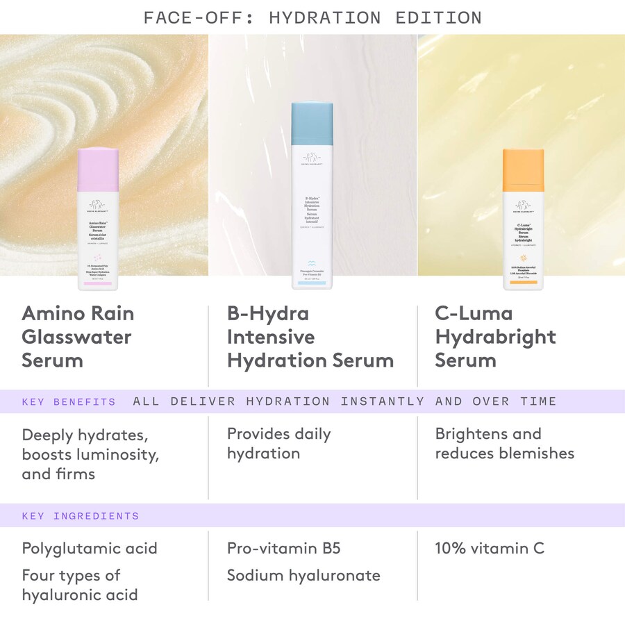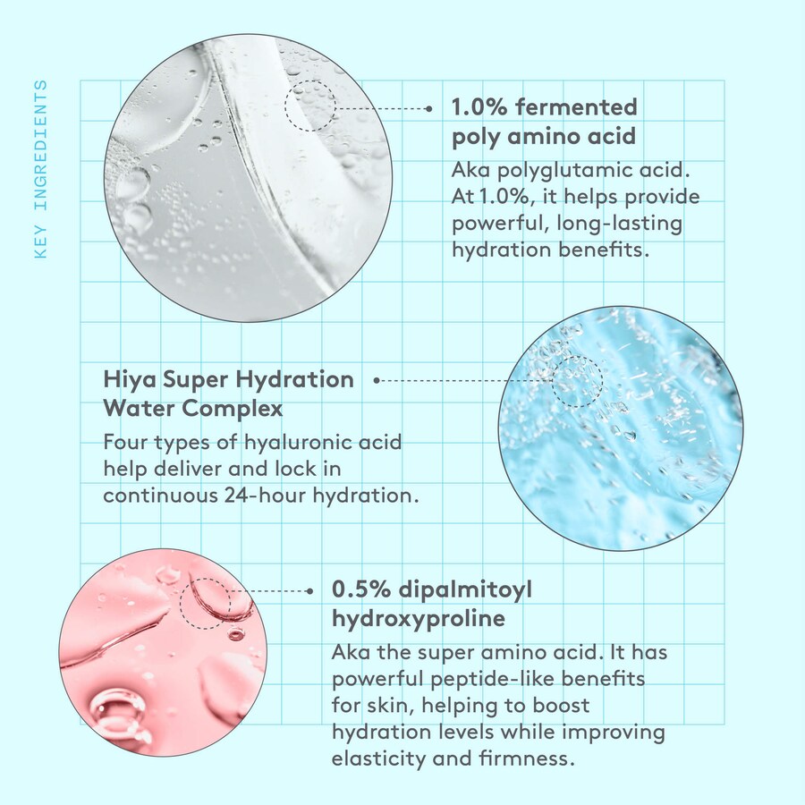- Hiya Super Hydration Water Complex: Four types of hylauronic acid that help lock in 24-hour hydration, improve elasticity, and defend against environmental free radical damage