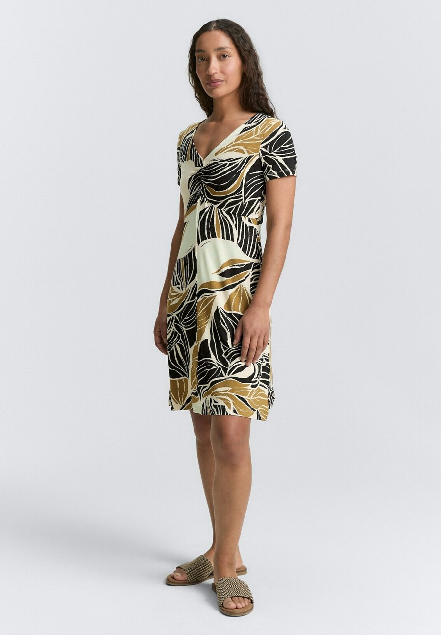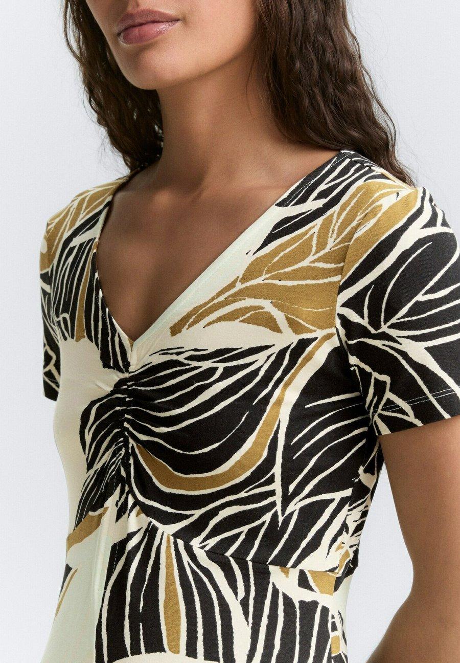 Платье длиной до колена с небольшими оборками. Изготовлено из однослойного трикотажа с небольшим содержанием эластана для комфортной посадки. Вырез горловины: Низкий V-образный вырезМатериал и уход