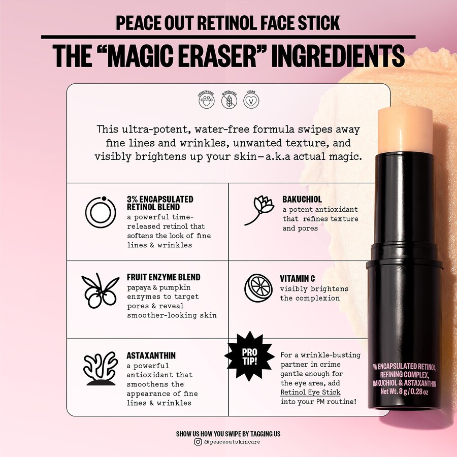 Что еще нужно знать: Этот суперконцентрированный стик для лица содержит 3% инкапсулированного ретинола для уменьшения видимости мелких морщин и фруктов, а также смесь фруктовых ферментов, сочетающую ферменты папайи и тыквы, которые воздействуют на поры и делают кожу более сияющей и гладкой.