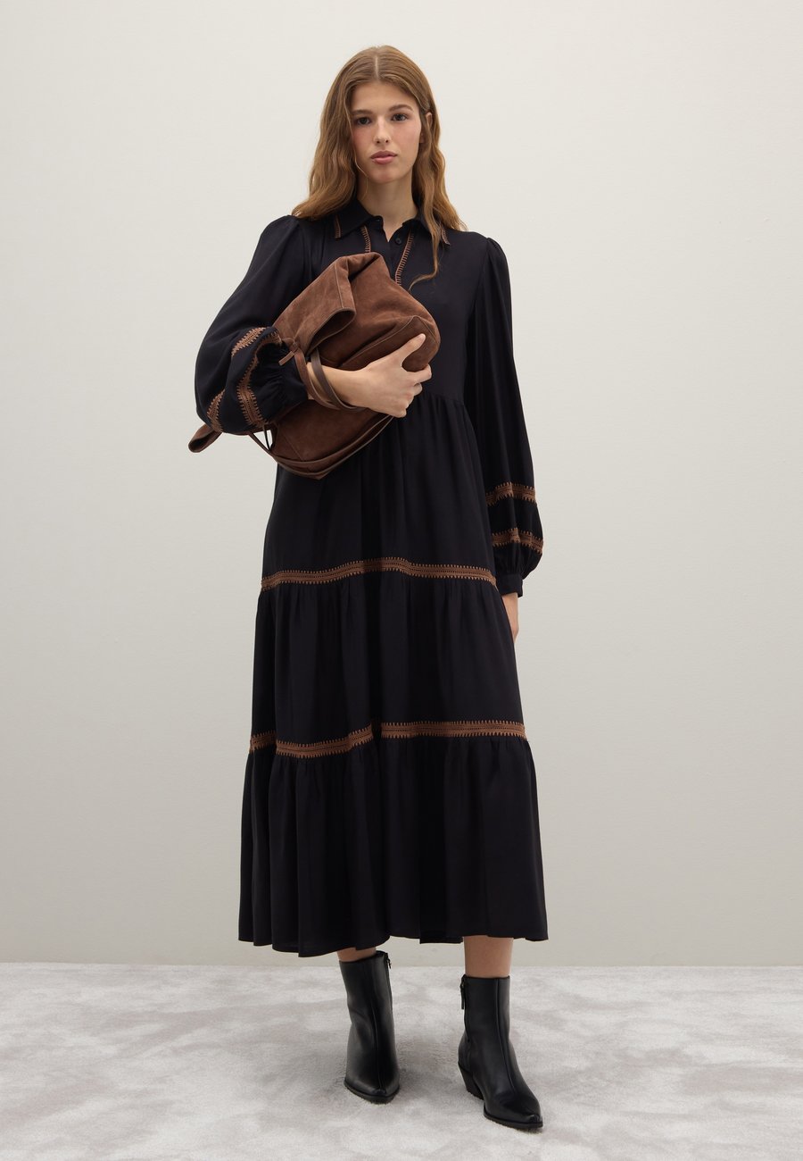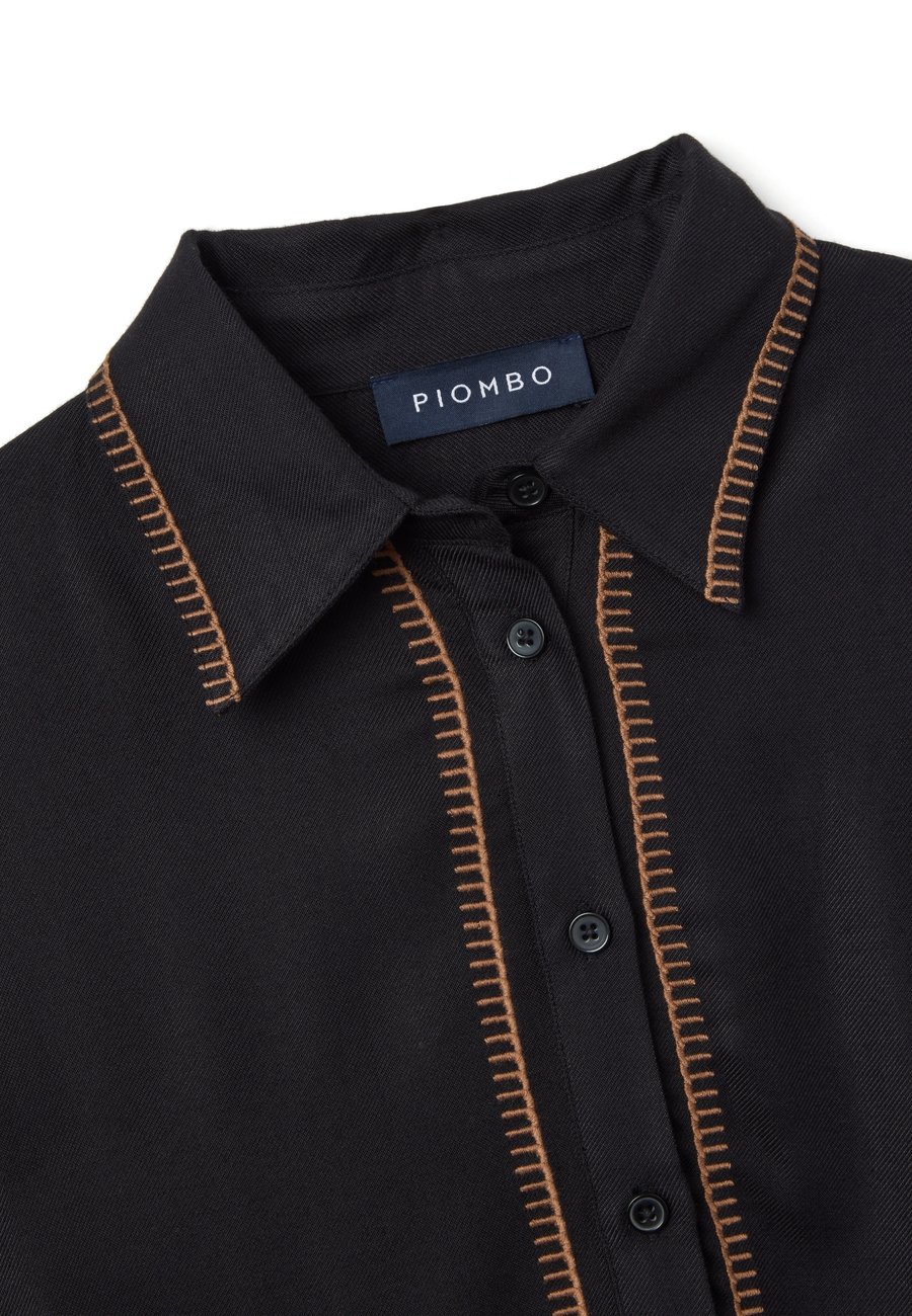 Элегантное длинное черное платье с контрастной вышивкой из линии Piombo. Оно обеспечивает комфортную и изысканную посадку. Рубашка с отложным воротником и застежкой на пуговицы спереди добавляет элегантности, идеально подходящей для особых случаев или для придания изысканности вашему повседневному гардеробу. Воротник: Отложной воротникМатериал и уход