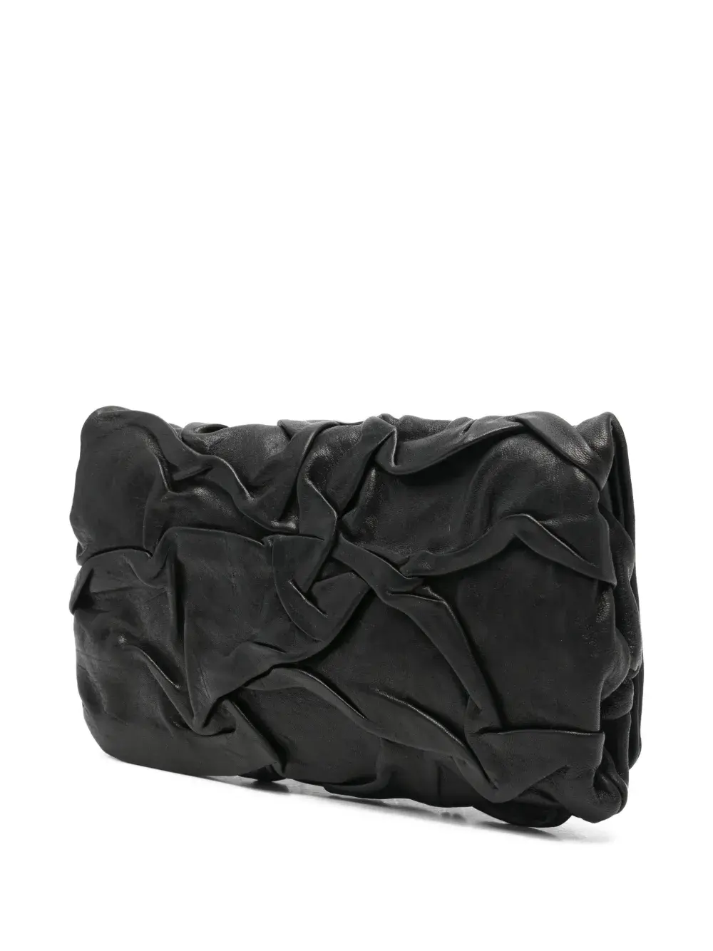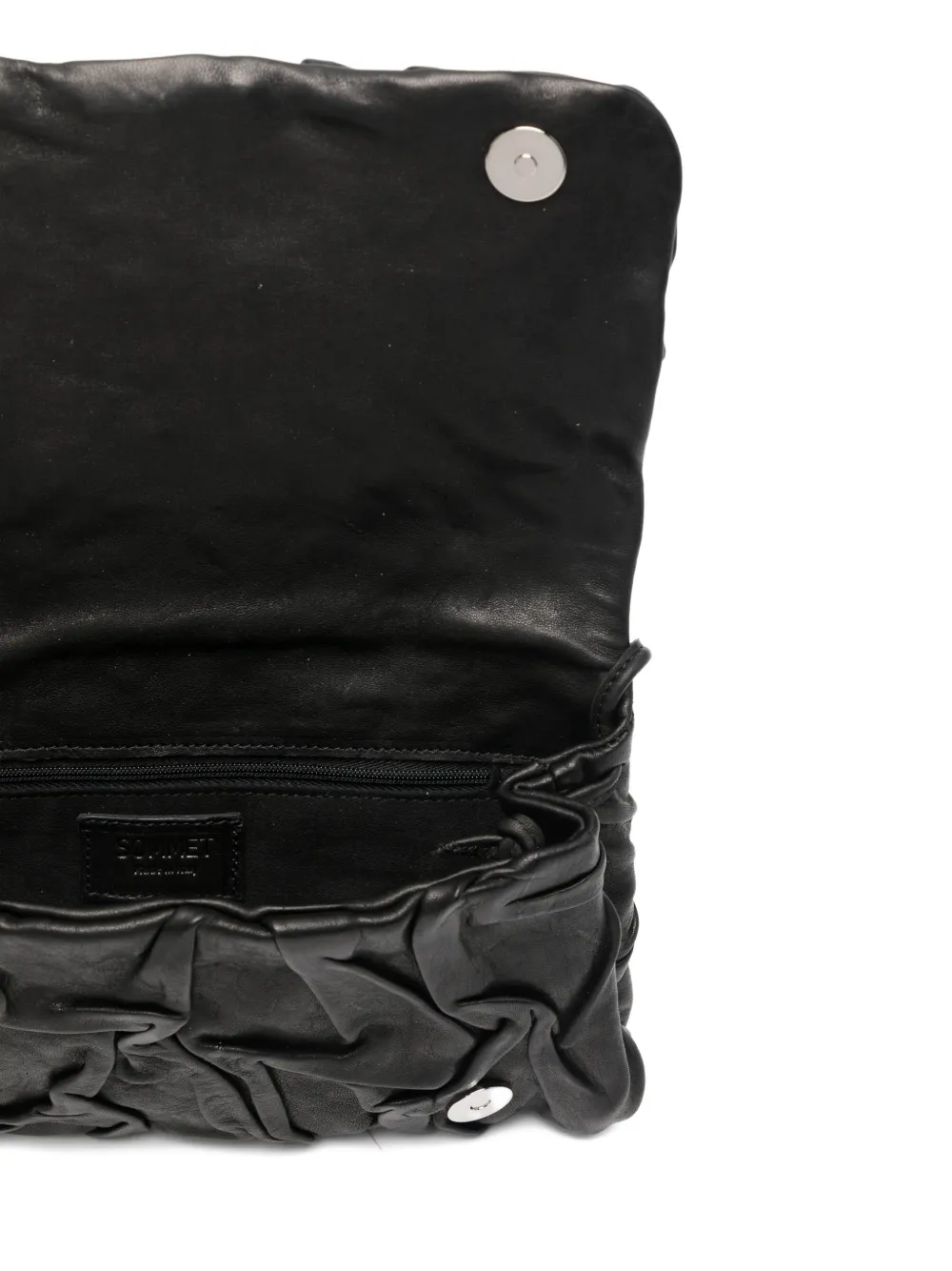 Черная сумка с жатой отделкой, одной плечевой лямкой, внутренним карманом на молнии, магнитной застежкой. В комплекте чехол для хранения.