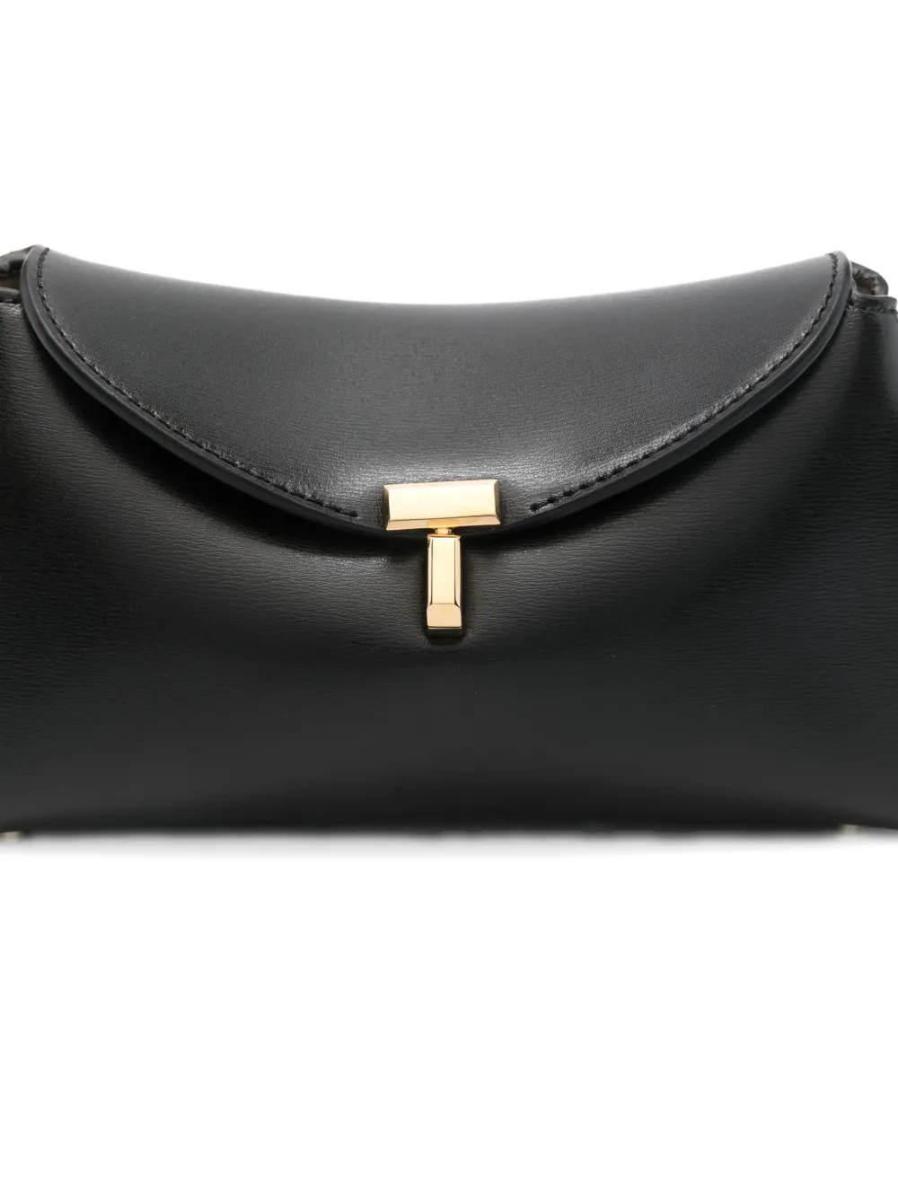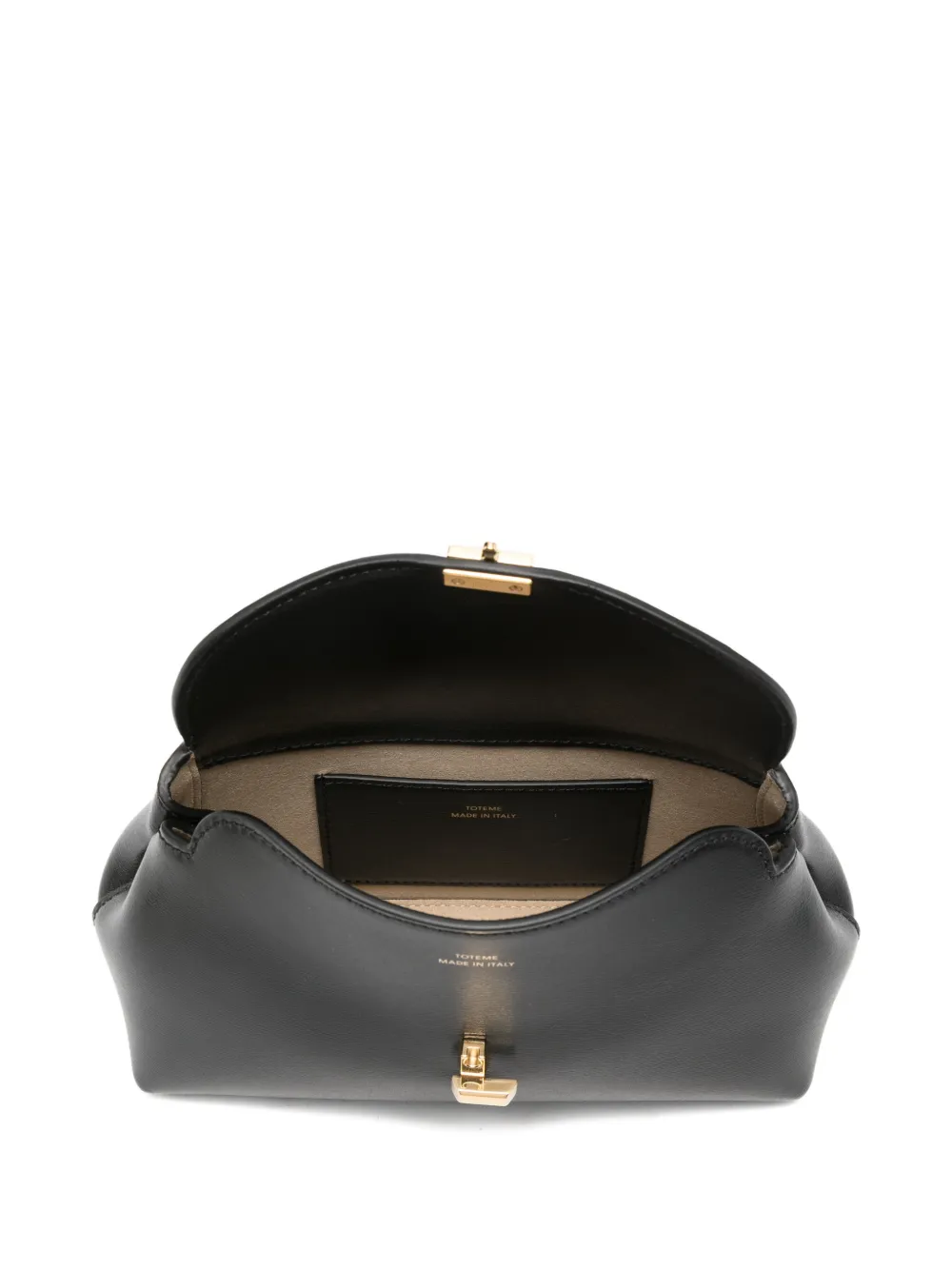 Чёрная с фурнитурой золотистого цвета, верхняя ручка, откидной клапан, внутренний накладной карман