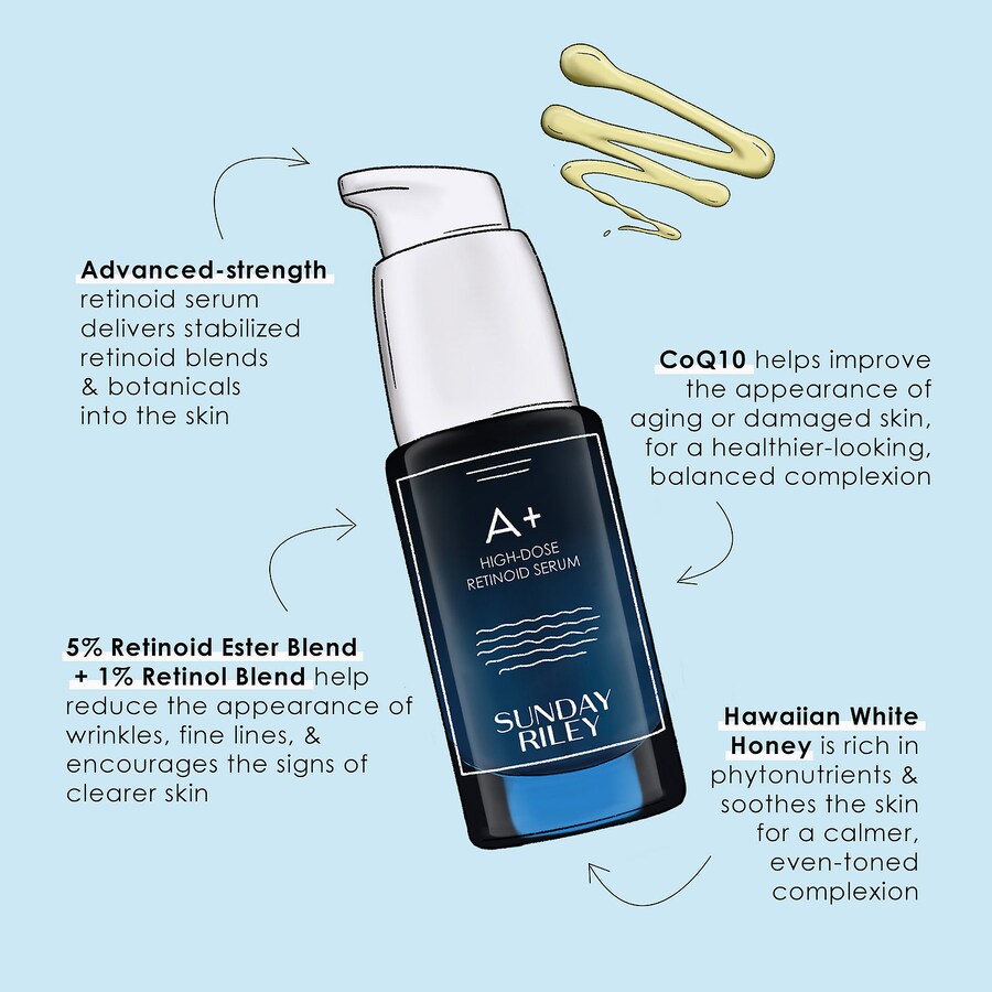-Нанесите увлажняющее масло, например, Juno Antioxidant Superfood Face Oil (продается отдельно), или увлажняющий крем перед нанесением сыворотки A+ High-Dose Retinol Serum.