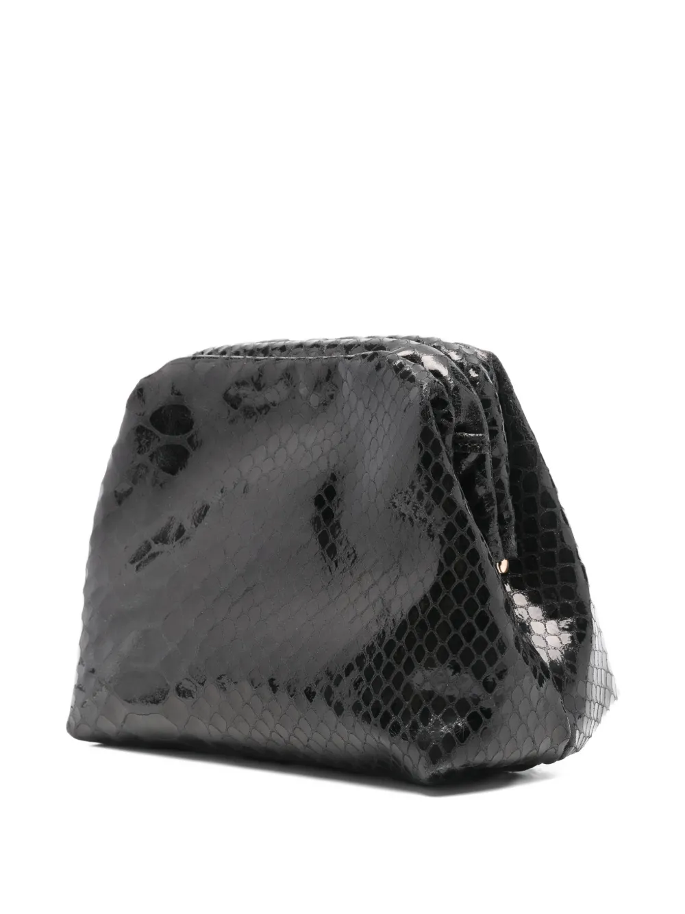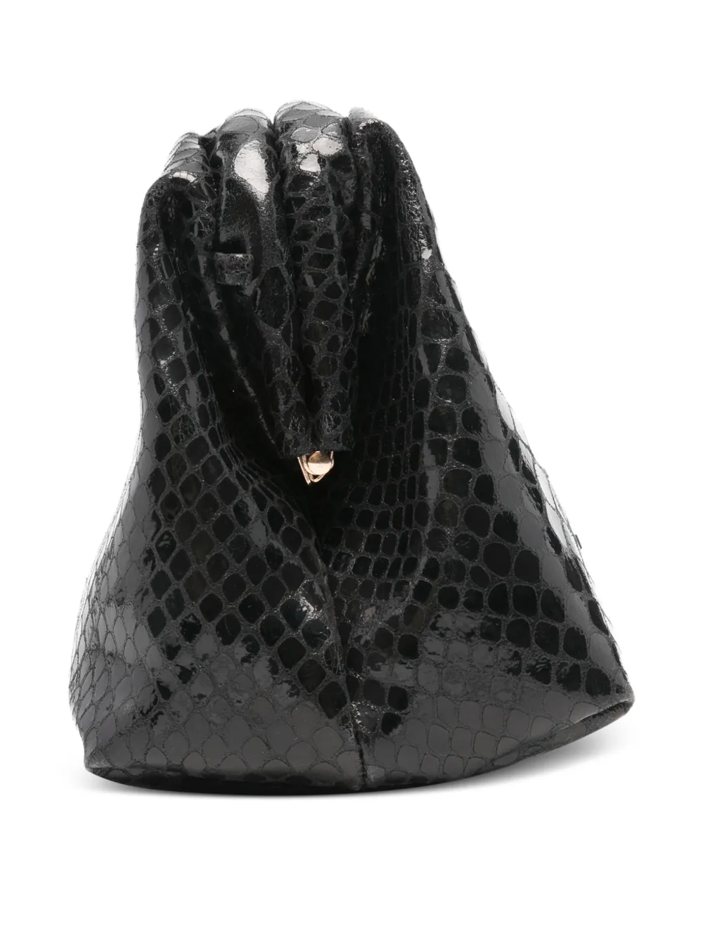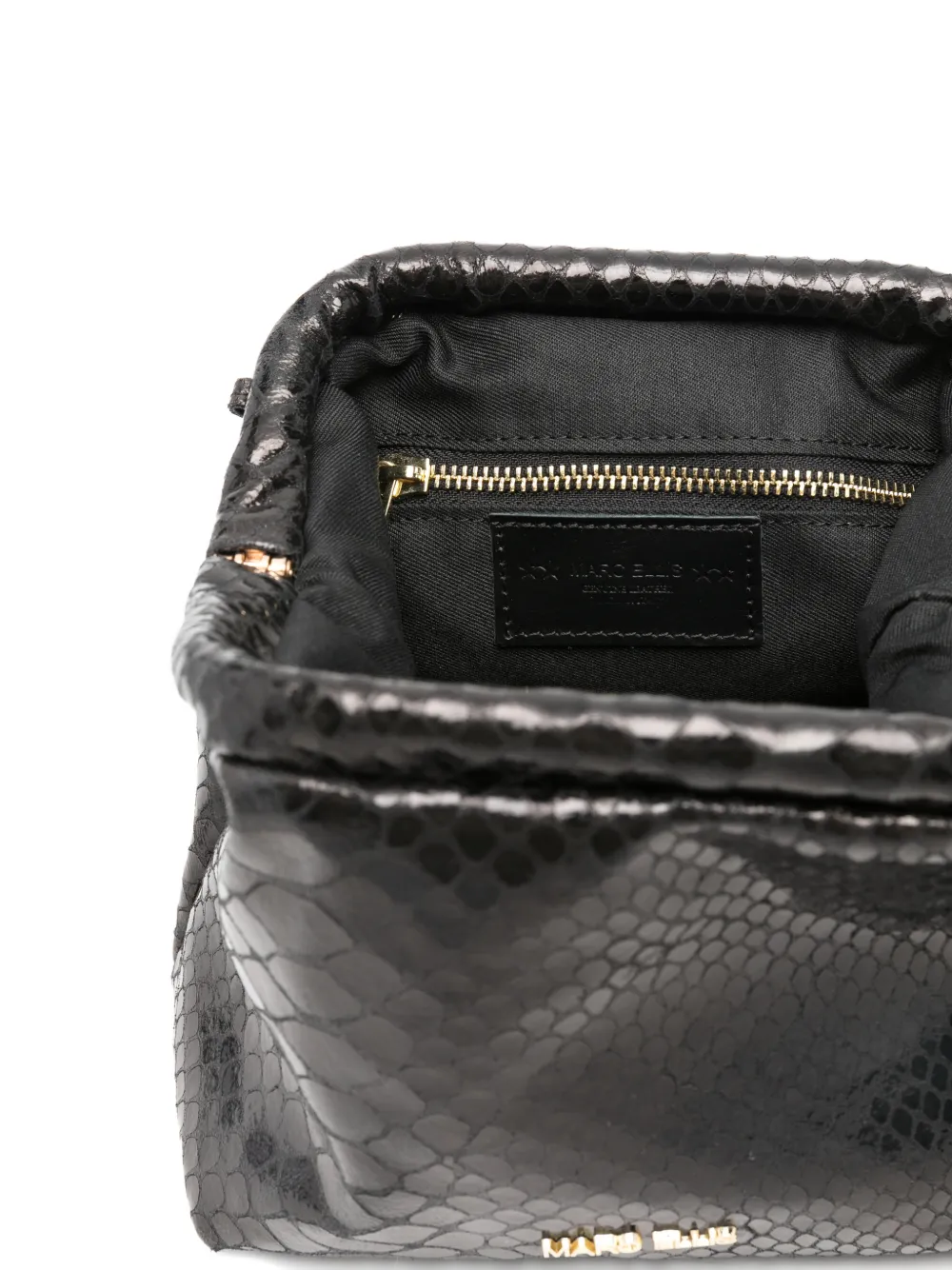 Черная сумка с тиснением под змеиную кожу, деталью в виде цепочки, золотистой фурнитурой, внутренним карманом на молнии. В комплекте защитный чехол для хранения.