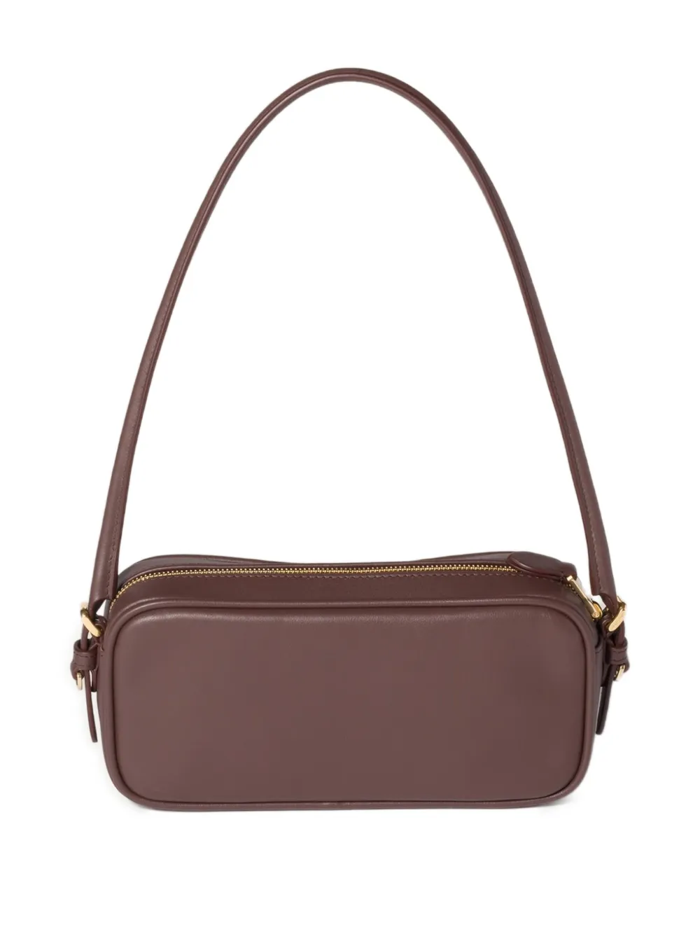 Коричневый топ с одной лямкой через плечо, логотипом-буквами и застежкой на молнии сверху
