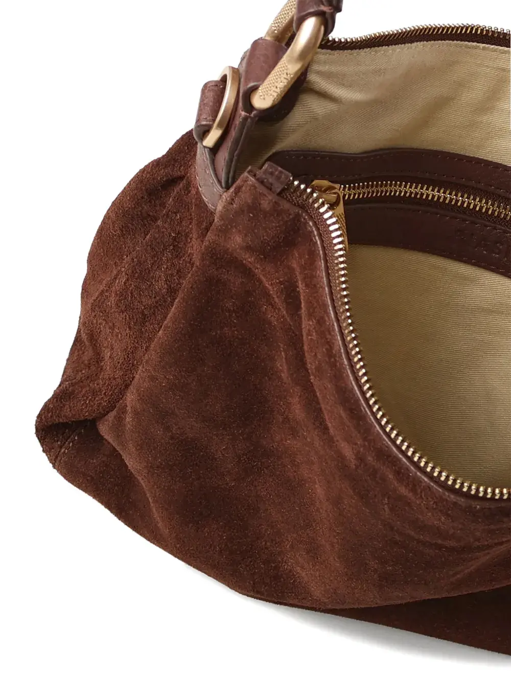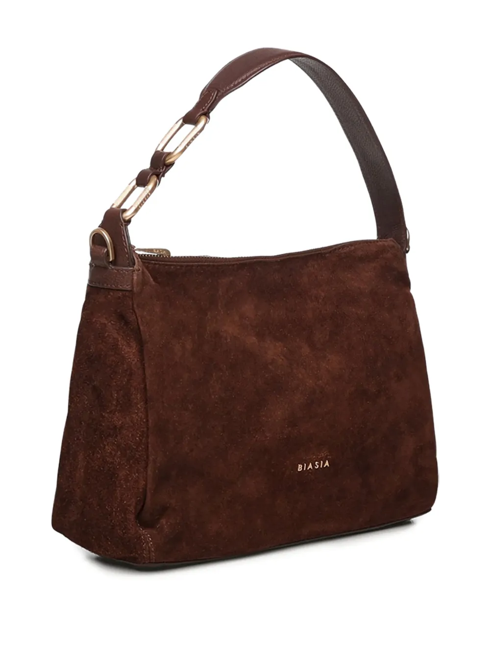 Темно-коричневая сумка с ручкой сверху, застежкой-молнией, кольцевой деталью, фурнитурой золотистого цвета и внутренним карманом на молнии