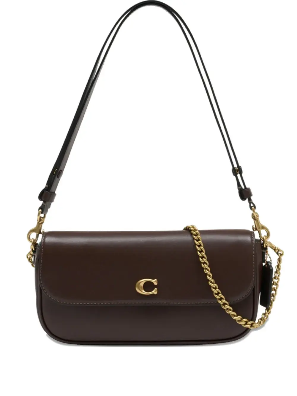 Коричневая кожаная сумка с логотипом, цепочным ремешком и фурнитурой золотистого цвета