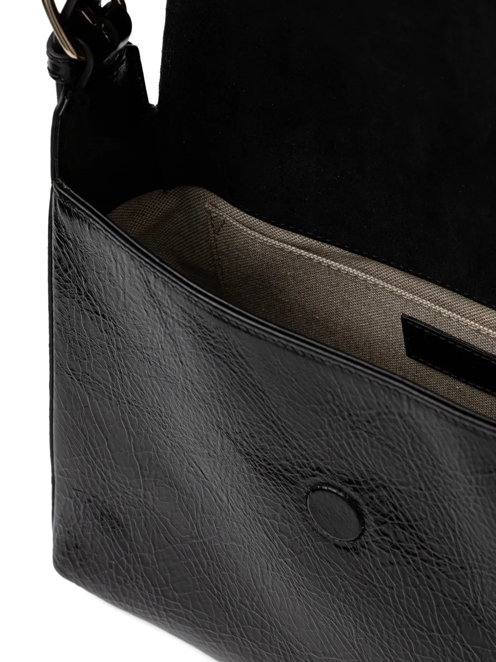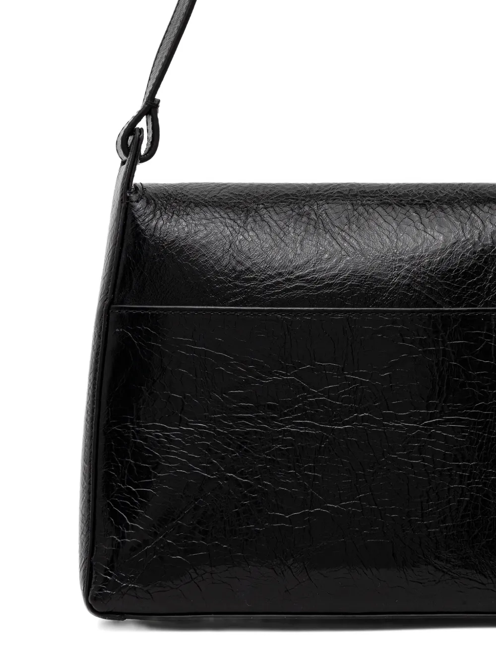 Черная ручка сверху, регулируемый плечевой ремень, откидной клапан, золотистая надпись с логотипом, внутренний накладной карман