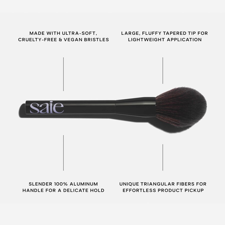 Что еще нужно знать: Эта кисть для пудры ручной работы специально разработана для использования с запеченной фиксирующей пудрой Saie Slip Tint Undetectable Baked Setting Powder (продается отдельно) и другими пудровыми формулами. Она изготовлена из уникальной комбинации трех типов треугольных веганских волокон, имитирующих традиционную козью шерсть. Его тонкая, на 100% алюминиевая ручка обеспечивает деликатный захват и легкое нанесение.