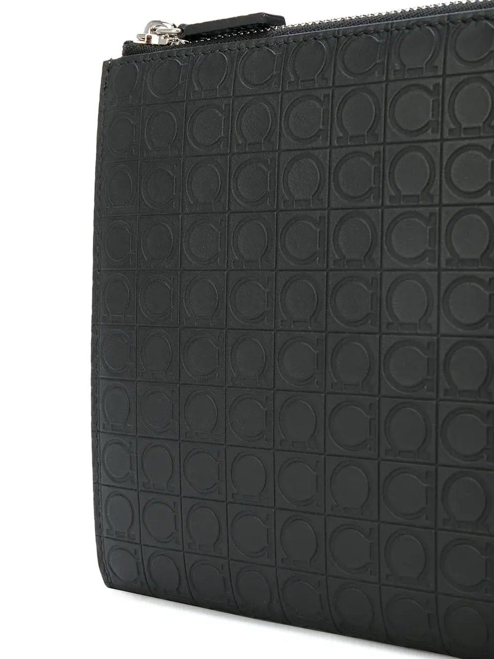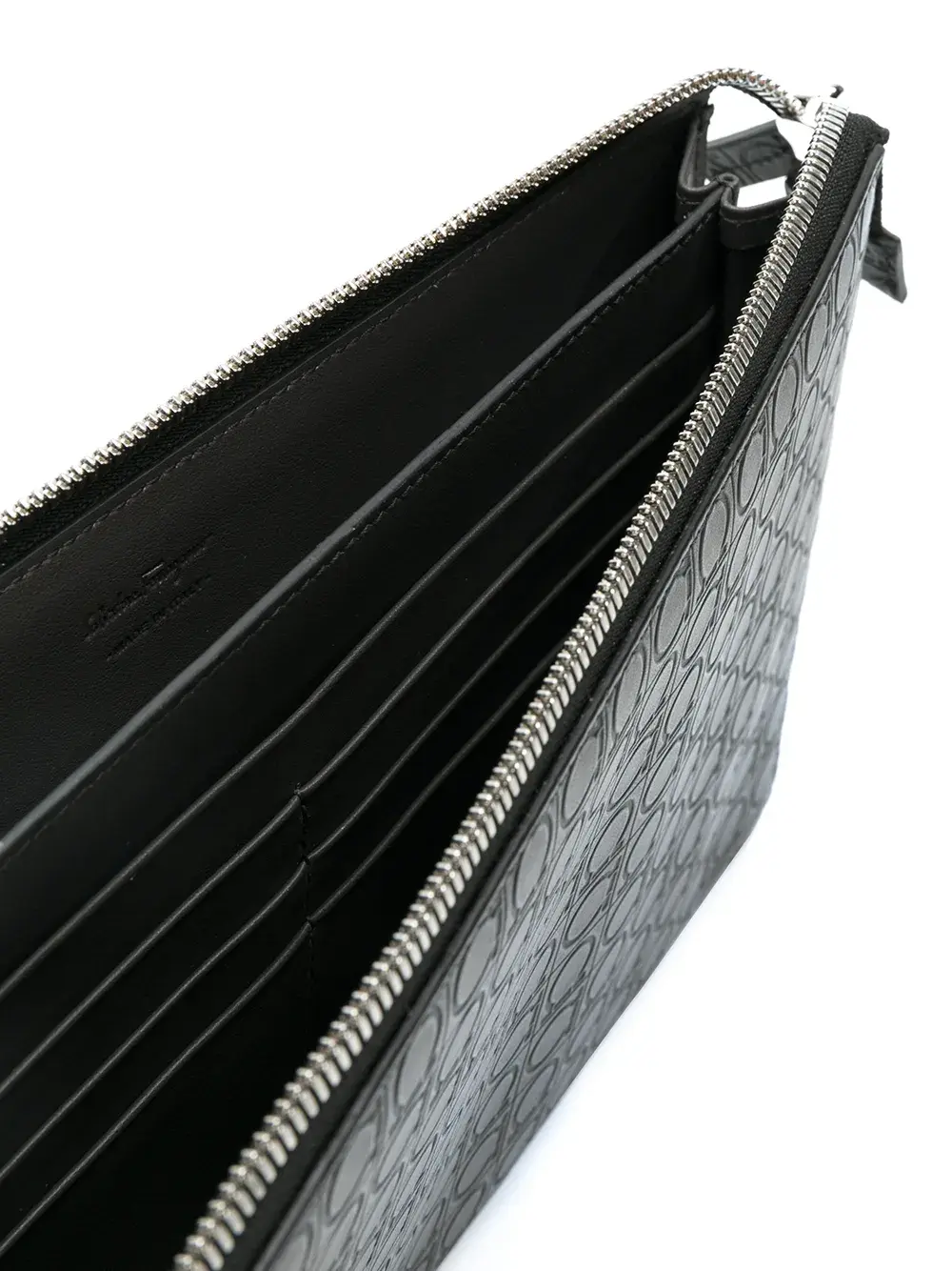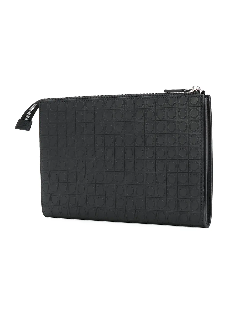 Черный кожаный клатч 'Gancino' от Salvatore Ferragamo(Сальваторе Феррагамо). Тисненая деталь, застежка на молнии сверху.
