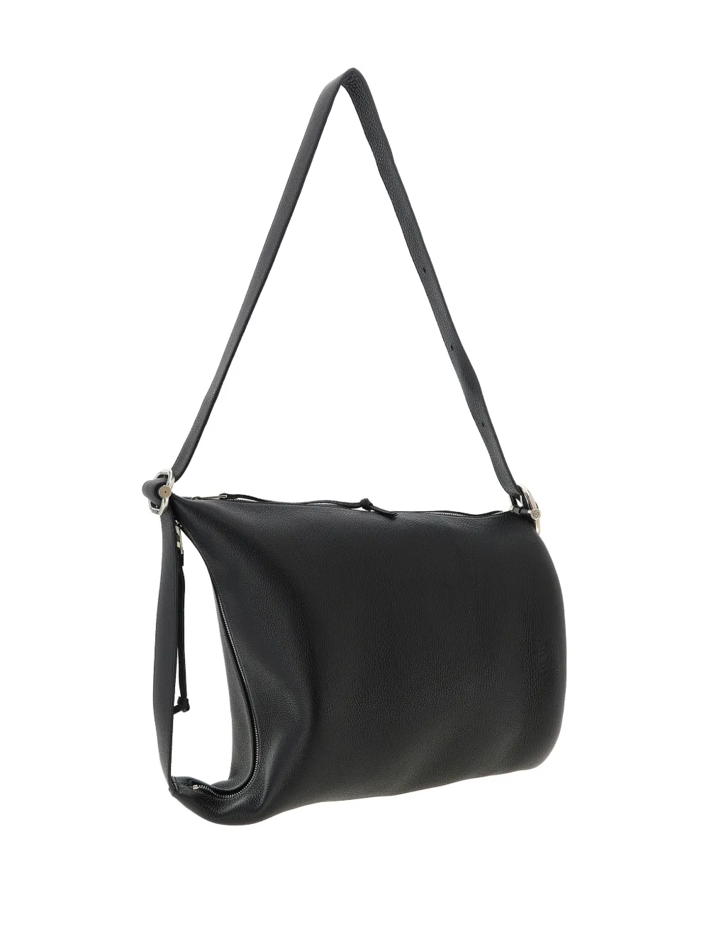 Черный регулируемый плечевой ремень, тиснёный логотип, логотип-анаграмма, гравировка логотипа на металлической пряжке, застёжка на молнии, жёсткое основание
