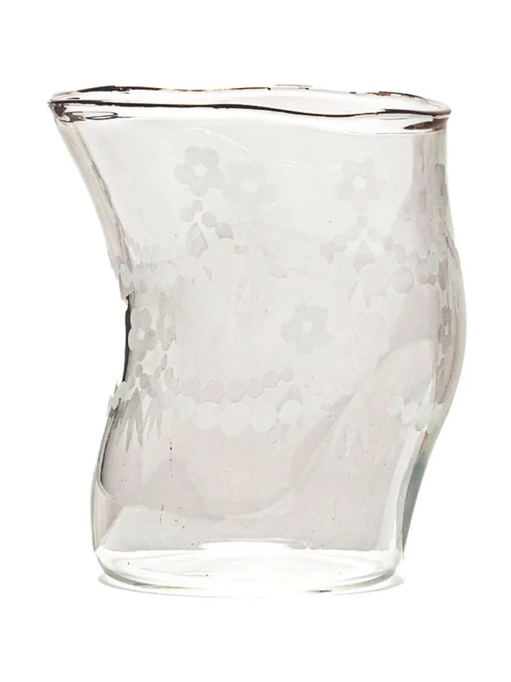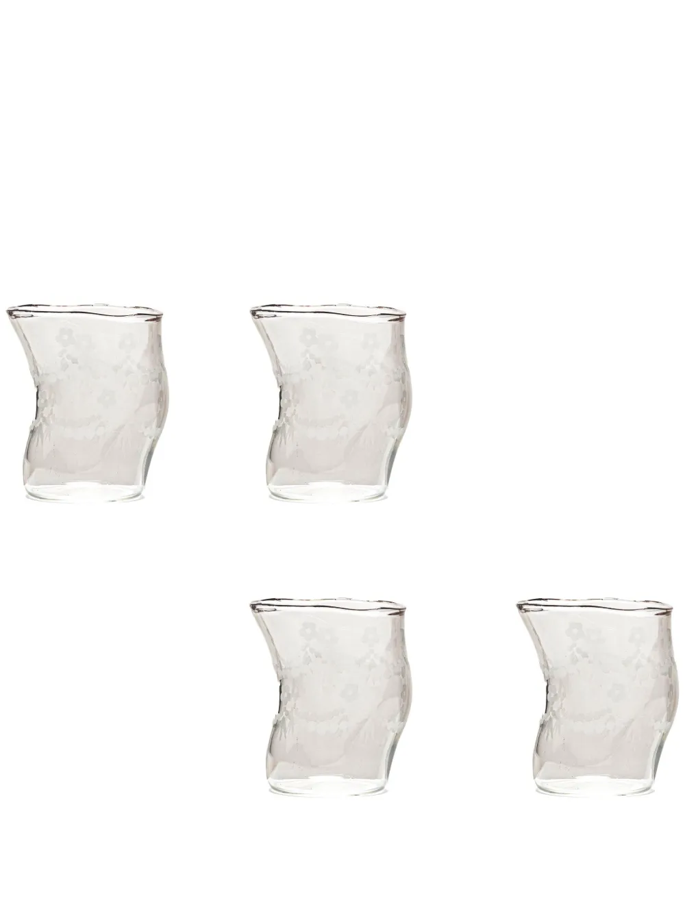 Белый, стекло, прозрачный материал, асимметричная форма, сплошной цветочный принт и набор из четырех предметов.