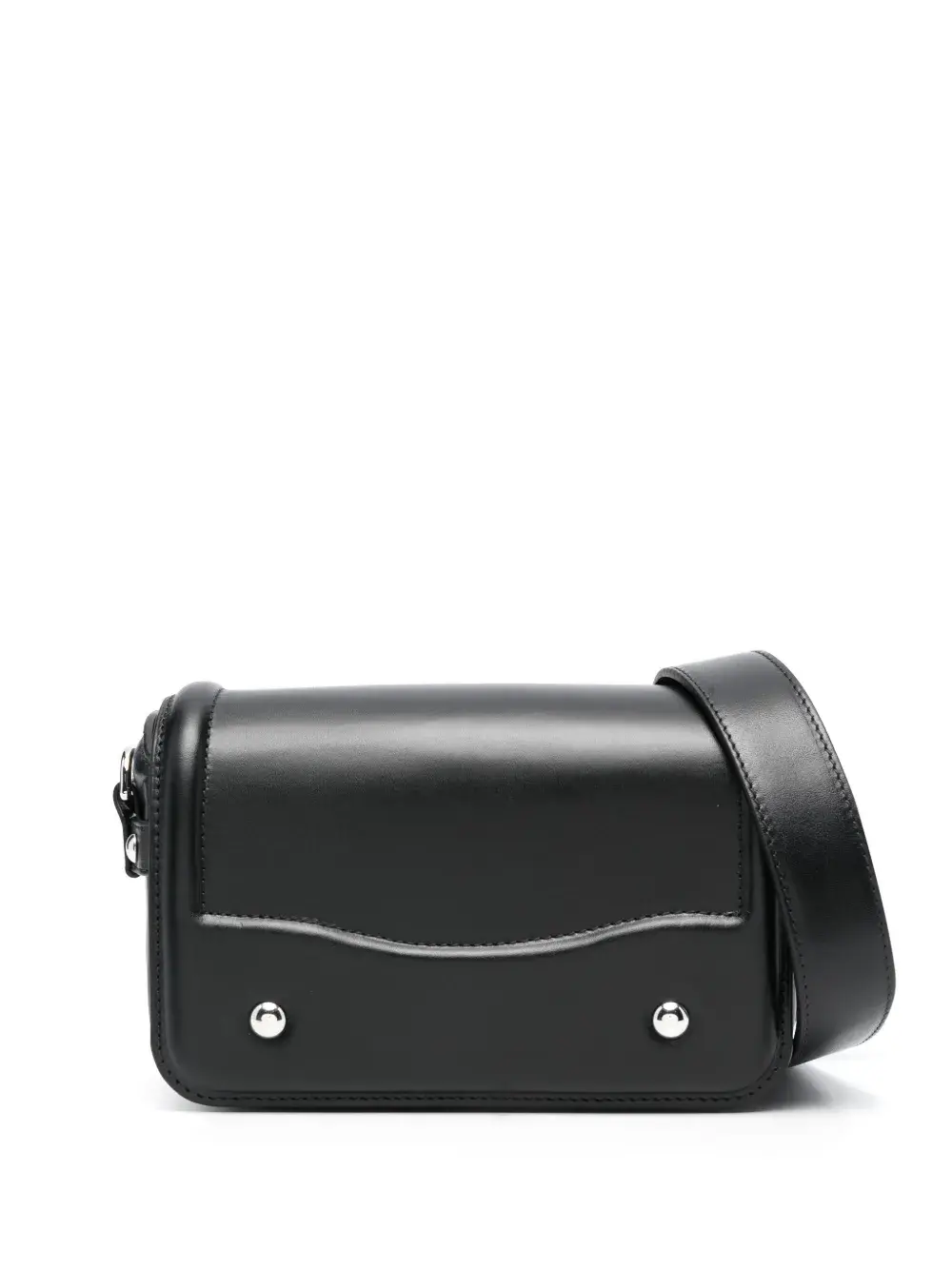 Черный, телячья кожа, тисненый логотип сзади, откидной клапан на магните, съемный регулируемый ремень на плечо, основное отделение, цельная подкладка, нашивка с логотипом внутри и внутренний прорезной карман.