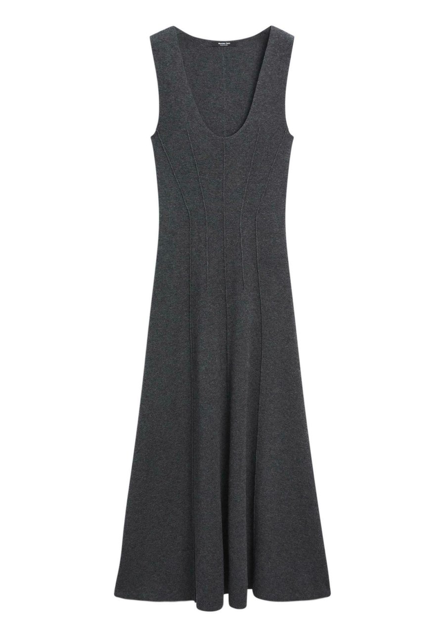 Без рукавов. Детали швов. Круглый вырез. Изготовлено из шерстяной смеси. Расклешенное. Платье. Вырез горловины: Круглый.Материал и уход
