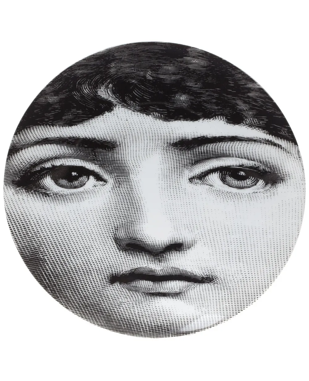 Черно-белая фарофорвая тарелка с принтом лица от Fornasetti.