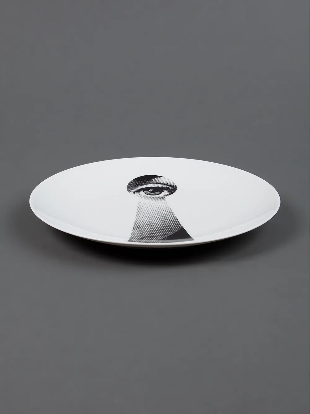 Белая керамическая тарелка с черным принтом от Fornasetti.