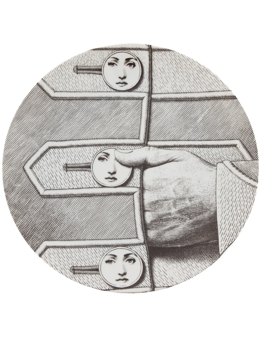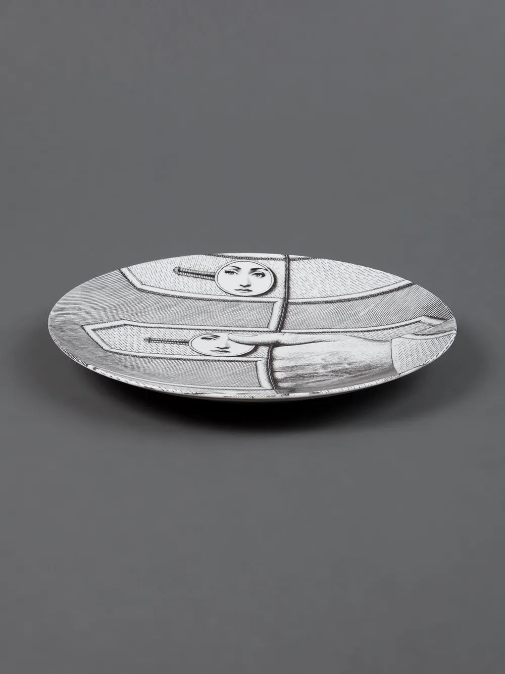 Чёрно-белая фарфоровая тарелка с рисунком от Fornasetti.