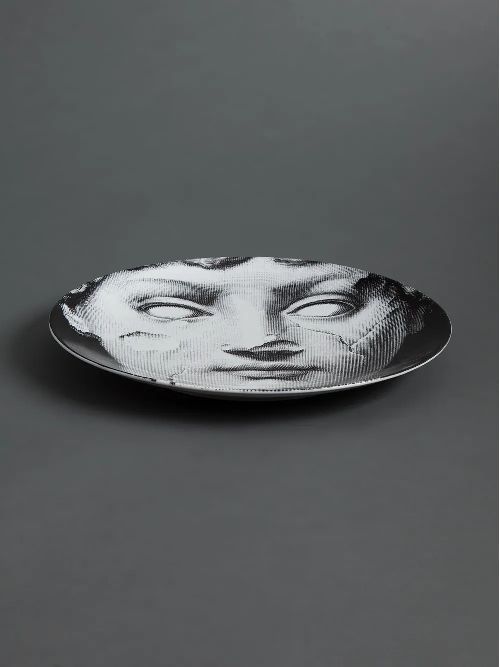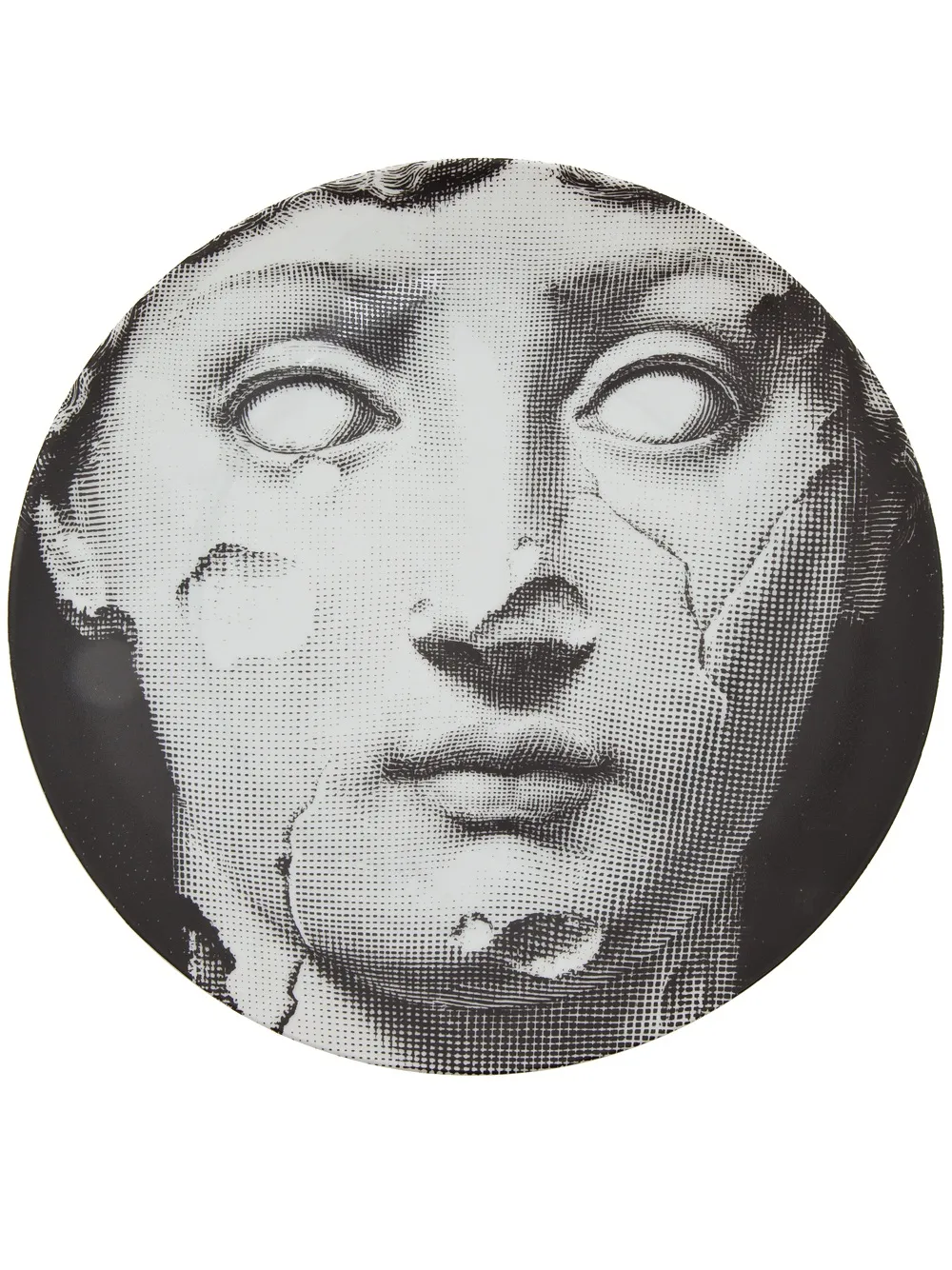 Черная фарфоровая тарелка от Fornasetti. Черно-белый принт в виде потрескавшегося бюста.