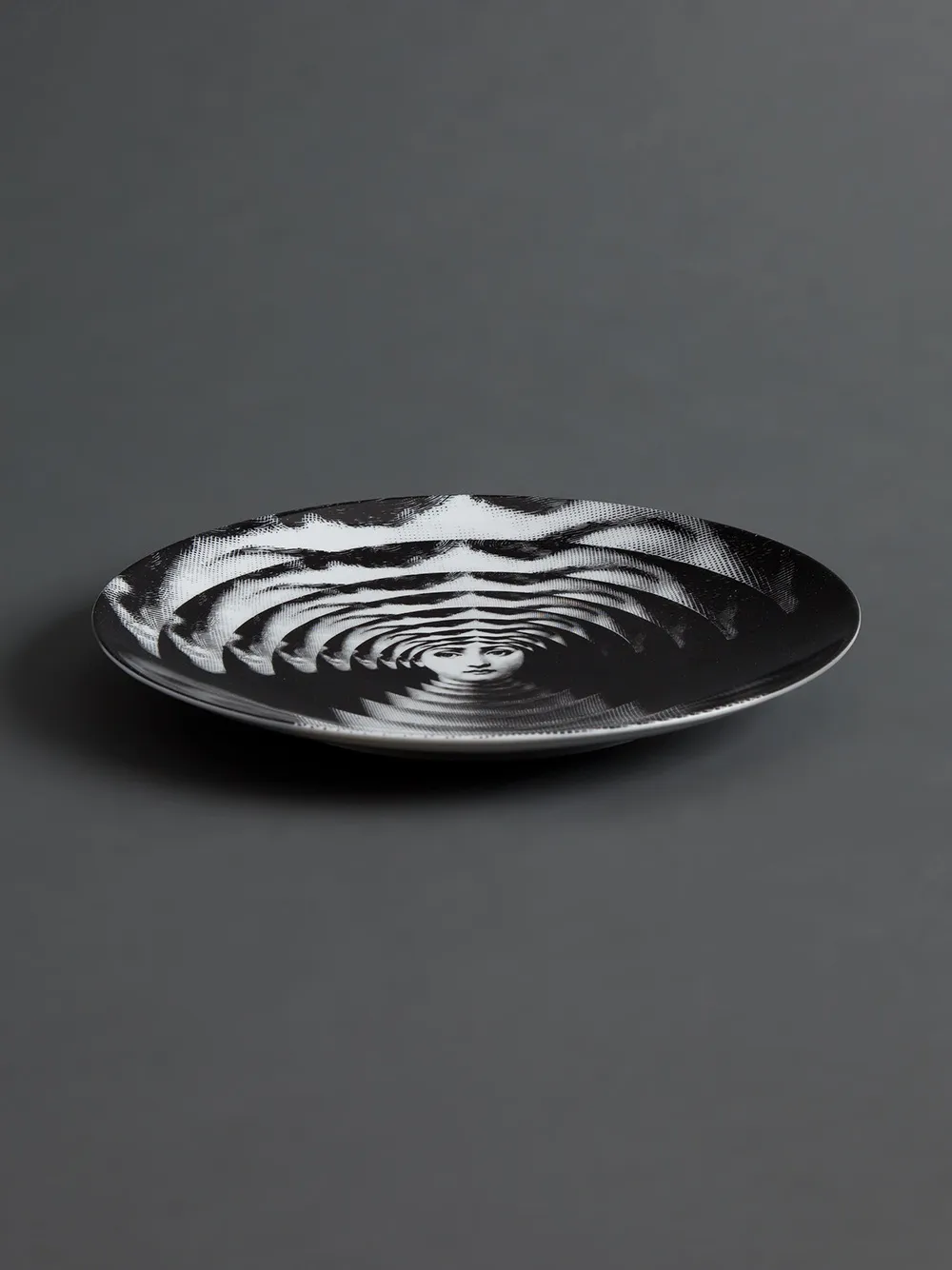 Чёрная с белым керамическая тарелка с рисунком от Fornasetti.