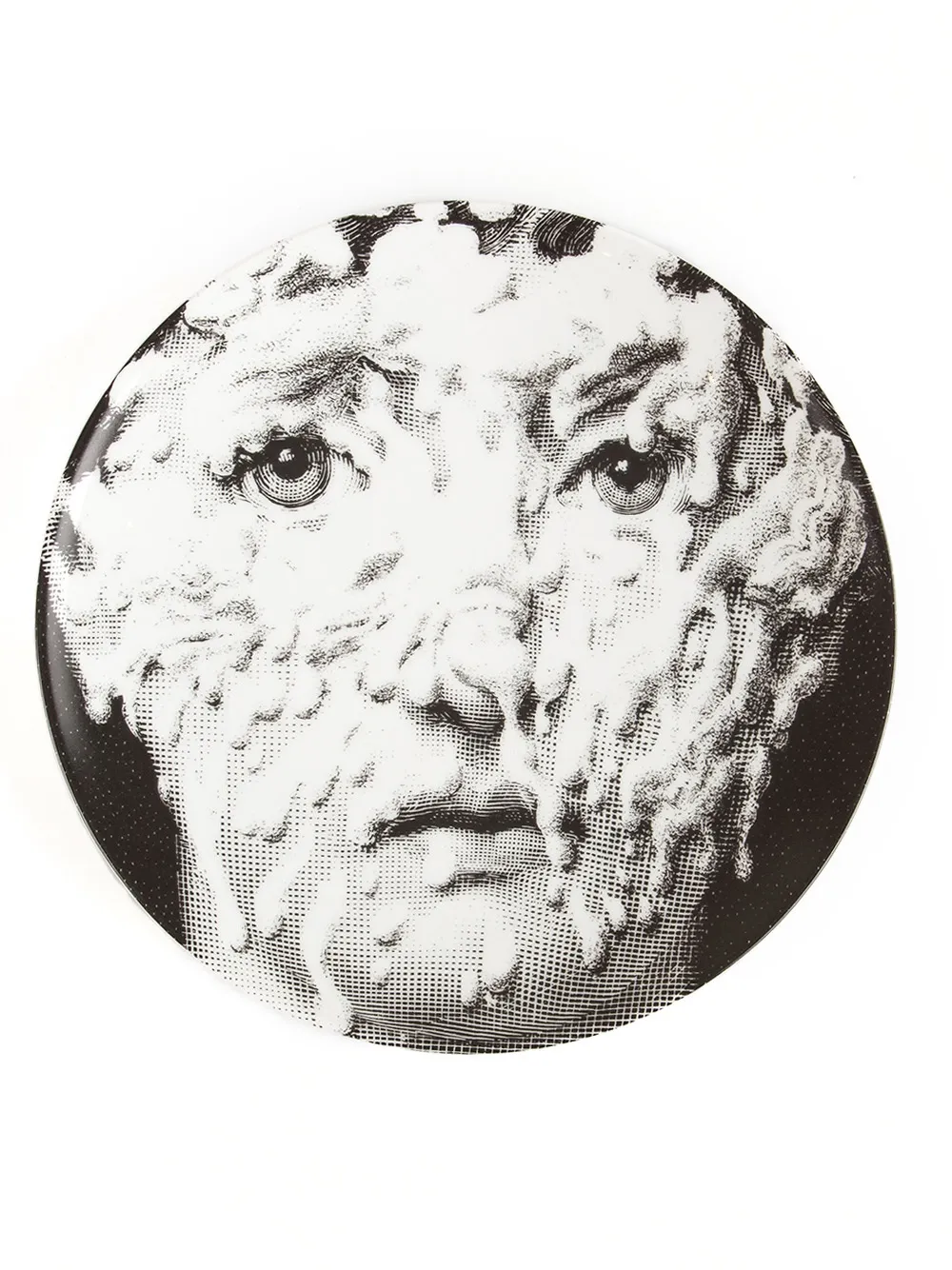 Чёрная с белым фарфоровая тарелка с принтом от Fornasetti.