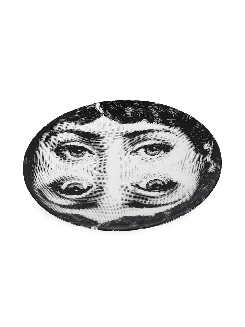Черная с белым керамическая тарелка 'mirror cameo' от Fornasetti. Округлая форма, графический принт.