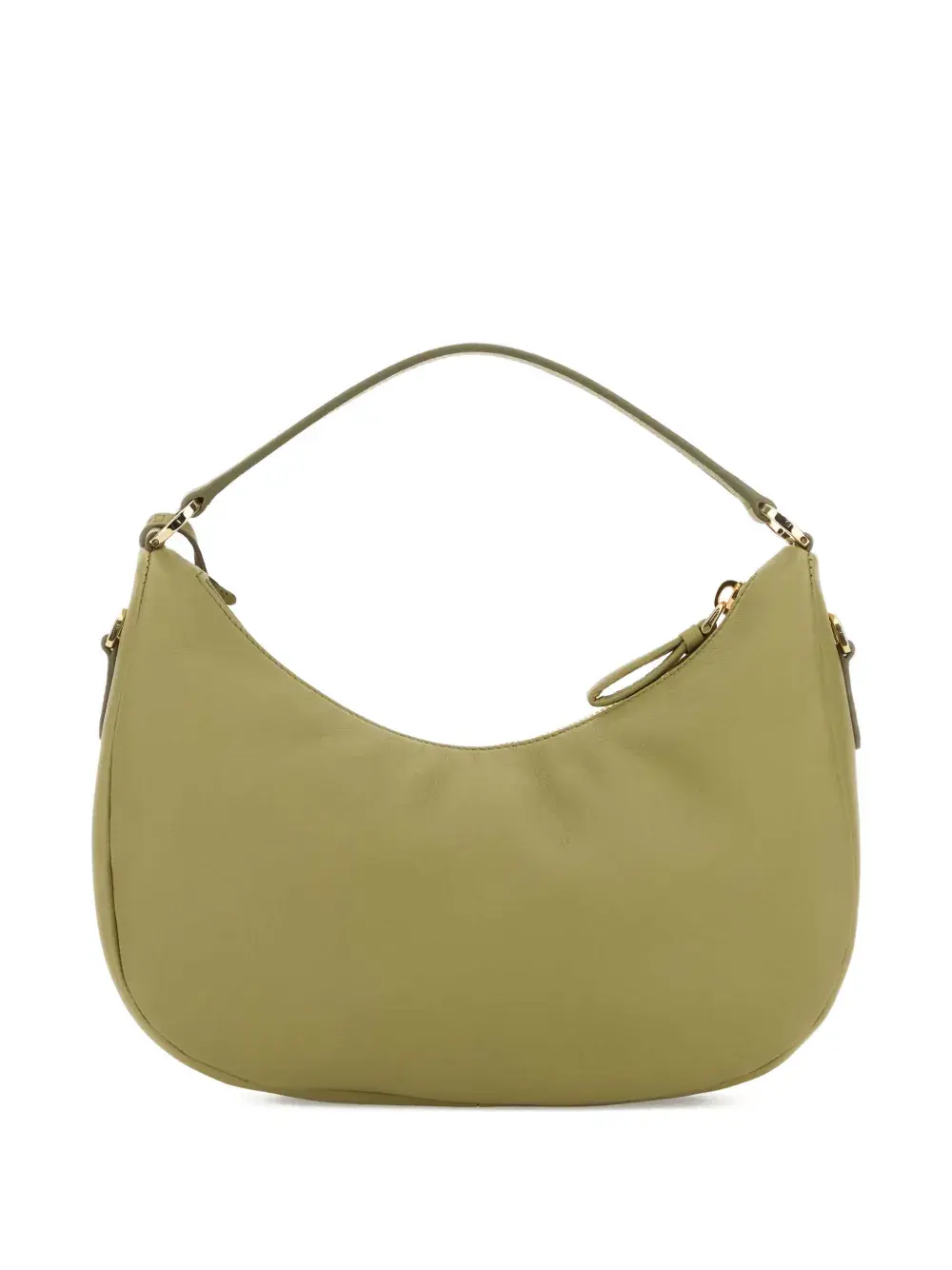 Шалфейно-зелёный цвет, фурнитура золотистого оттенка, верхняя ручка, логотип-пластина, застёжка на молнии
