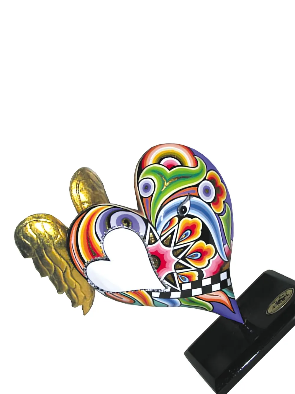 Белая подставка, расписанная разноцветными сердечками и крыльями