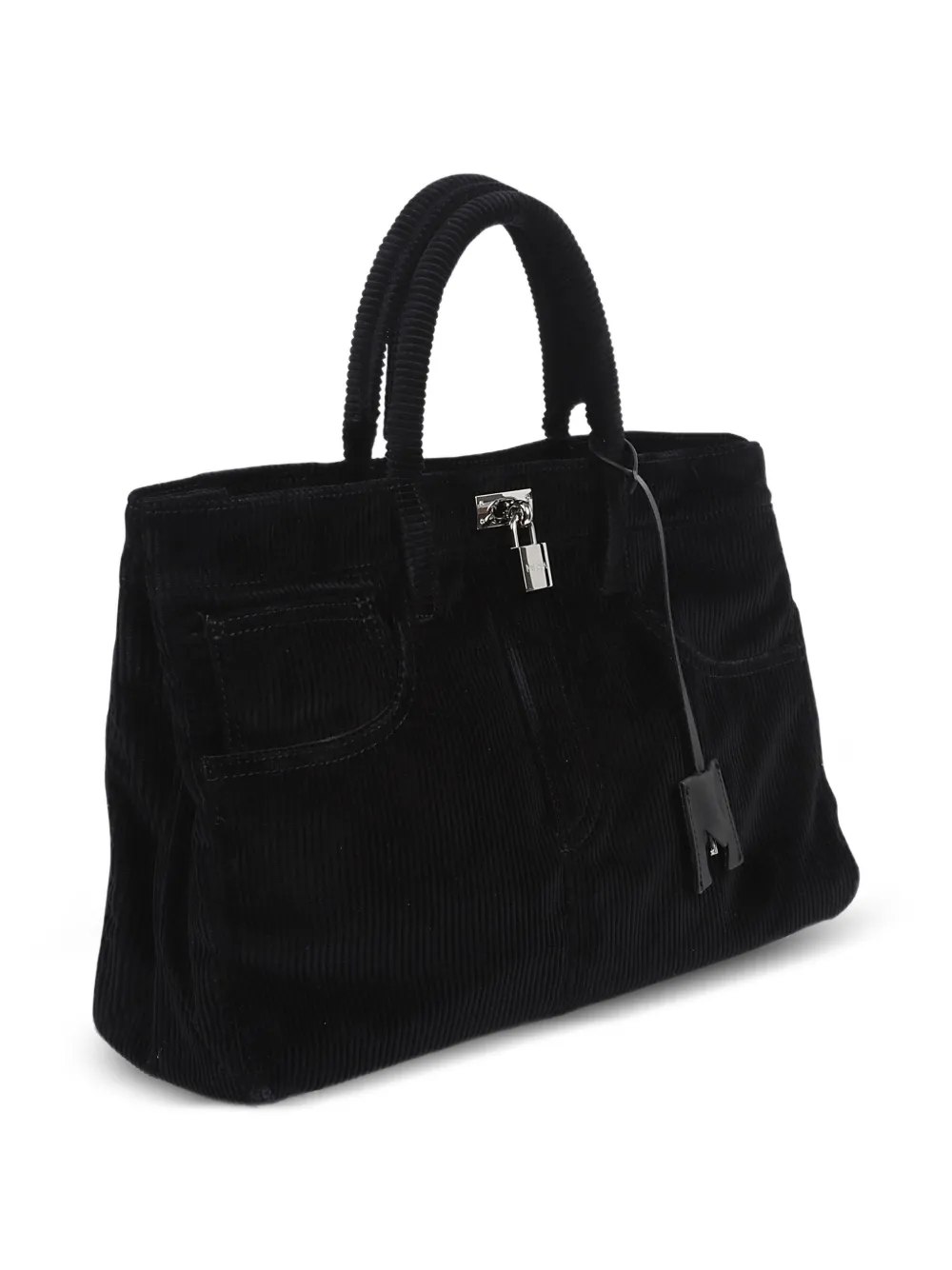 Черная сумка с фактурой вельвета, верхней ручкой, деталями в виде замка, кожаной биркой и передними карманами