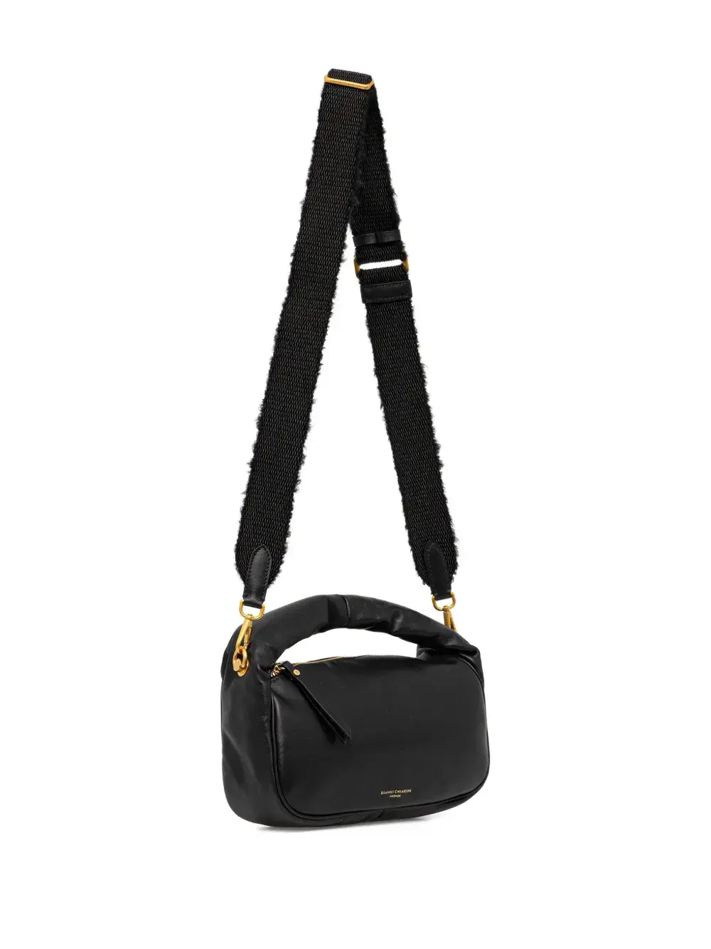 Черная сумка с одной верхней ручкой, фурнитура золотистого цвета, застежка на молнии, съемный регулируемый плечевой ремень, принт с логотипом