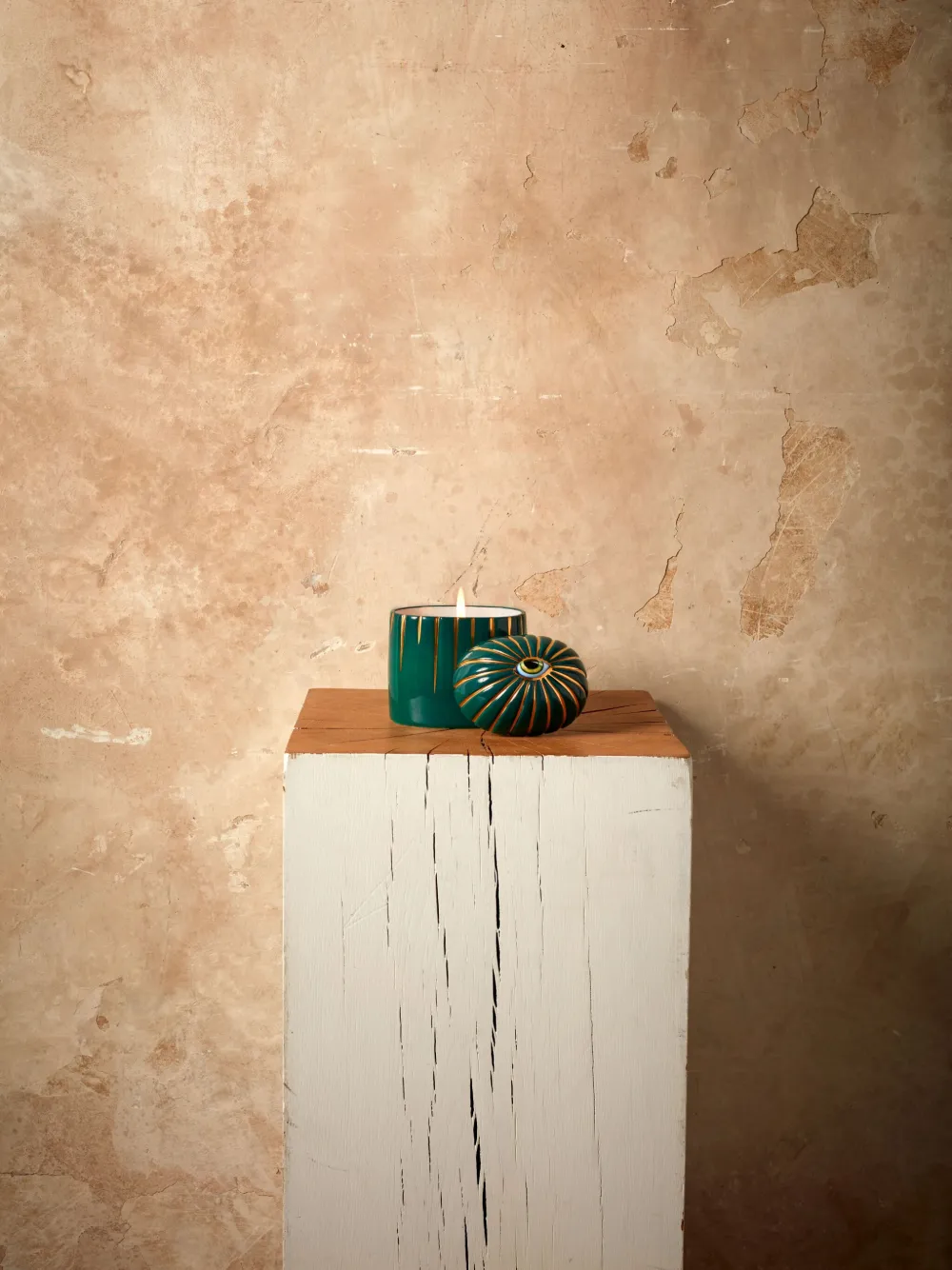 Зеленый, фарфор, узор с изображением глаза, полоски и крышка.