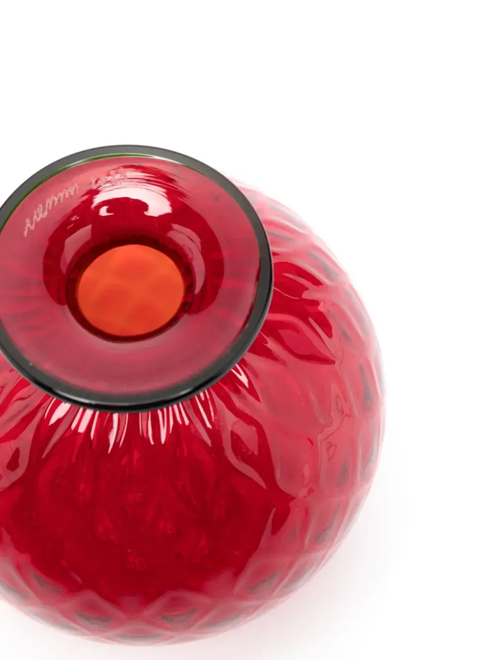 Маково-красный, стекло, стеганый материал, дизайн с открытым верхом и модель круглой формы.