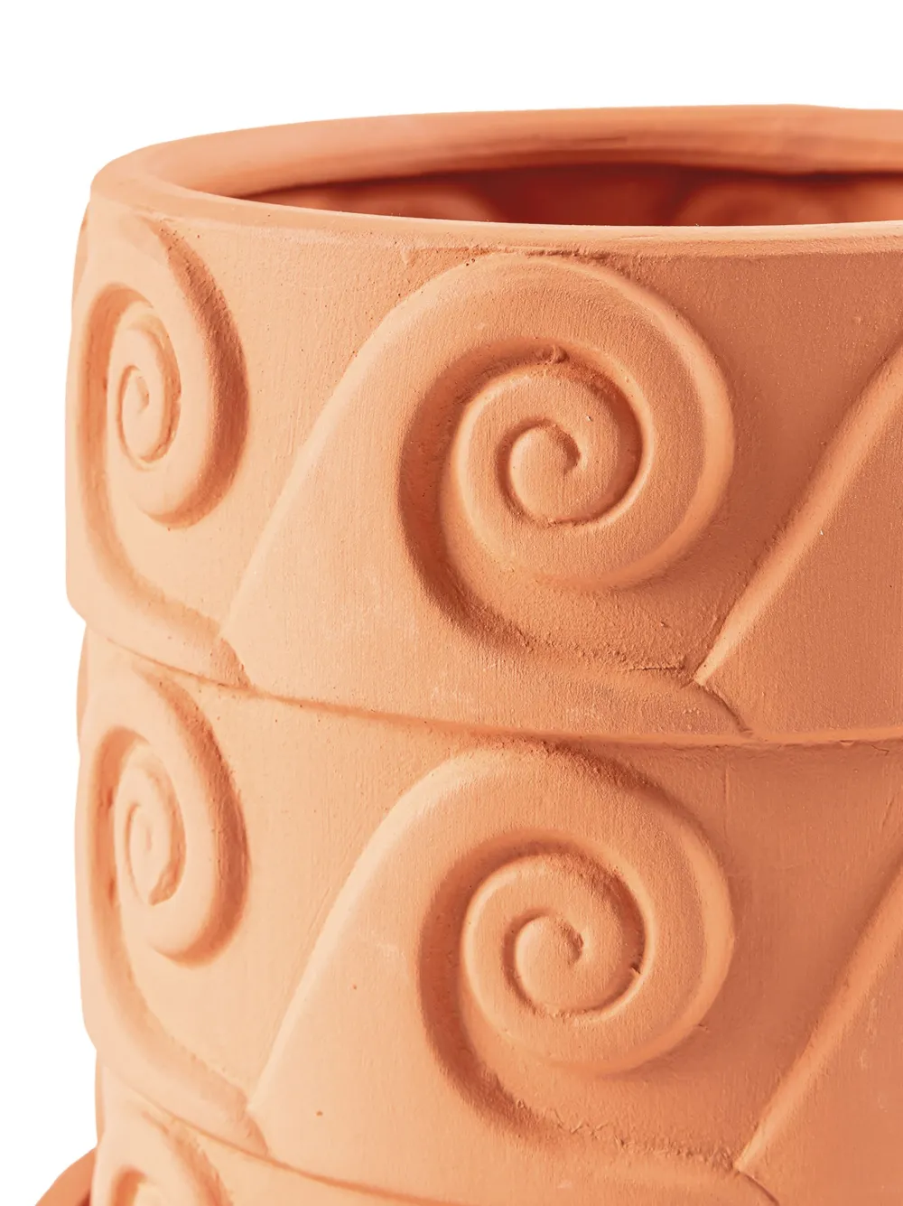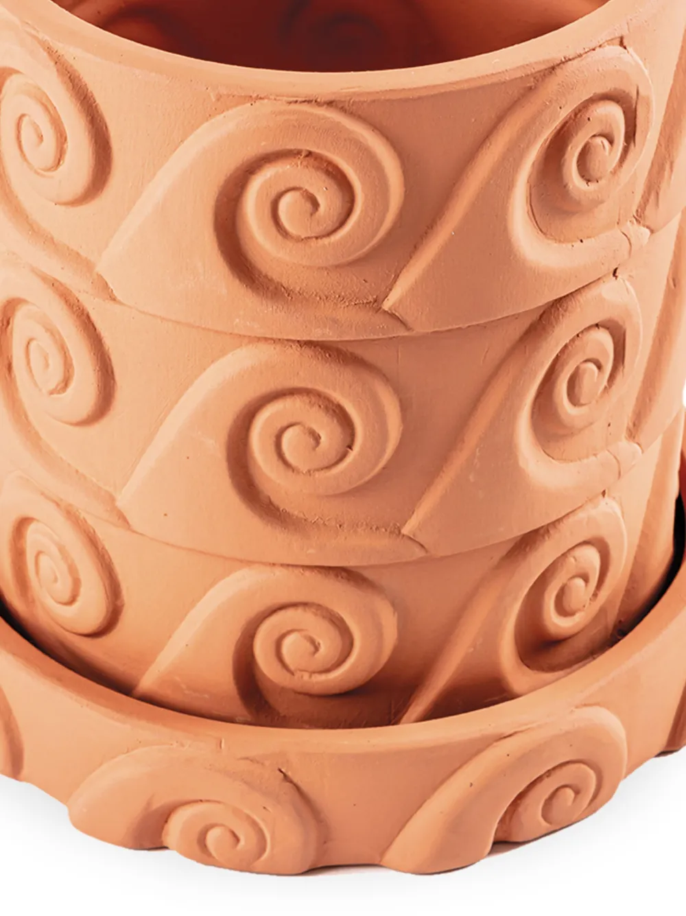 Терракота, керамика, матовое покрытие, волнистый принт, модель круглой формы и блюдце в комплементарной расцветке.