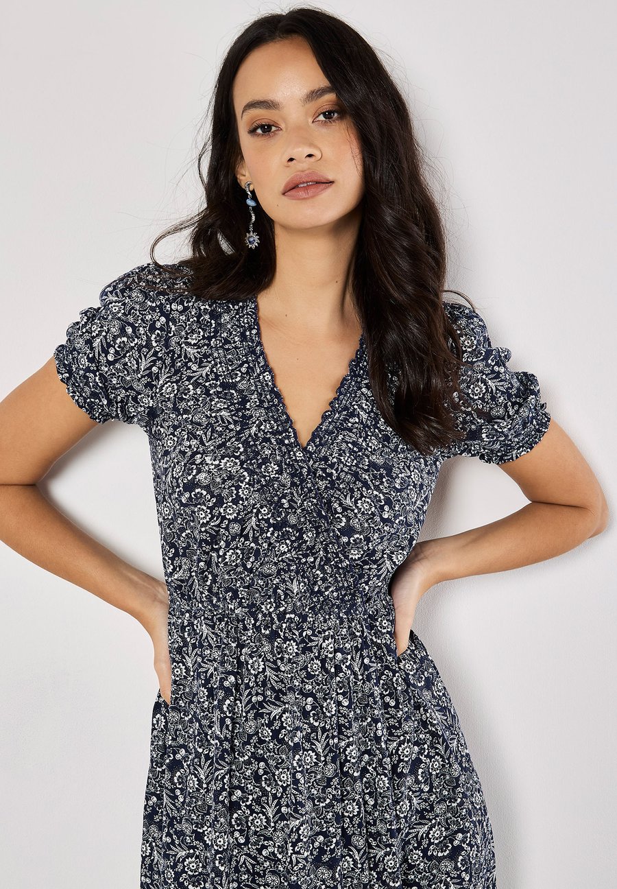 Это легкое и тканое платье миди украшено принтом с фруктами и цветами. Платье с V-образным вырезом и пышными рукавами дополнено изящным запахом. Вырез горловины: КаштановыйМатериал и уход