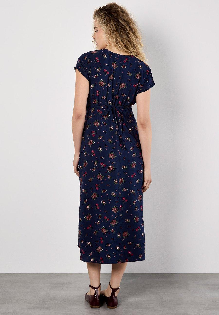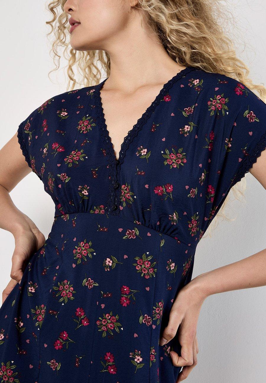 Это легкое и тканое миди-платье, которое обязательно должно быть в вашем гардеробе, сочетает в себе цветочные и сердечные принты и призвано украсить ваш повседневный образ. Платье с V-образным вырезом, отделанным кружевом, и короткими рукавами, имеет застежку на пуговицах, завышенную талию и тканевый пояс, создающий привлекательный силуэт. Платье отделано разрезом спереди на юбке. Вырез: глубокий V-образный. Застежка: пуговицы. Узор: цветочный. Детали: кайма. Материал и уход: 87% вискоза, 13% полиамид. Инструкции по уходу: не отбеливать, не сушить в сушильной машине, машинная стирка при 30 °C. Размер и посадка: рост модели 175 см, размер XS. Посадка: стандартная. Форма: облегающая. Длина: до середины икры. Длина рукава: короткий. Общая длина: 126,50 см (размер XS). Таблица размеров.Доставка товаров осуществляется курьером или на пункт выдачи заказов.