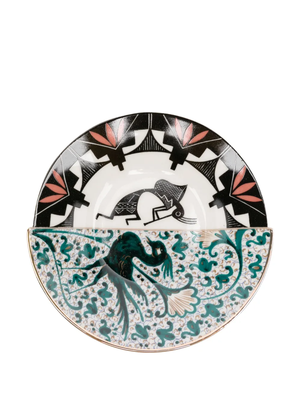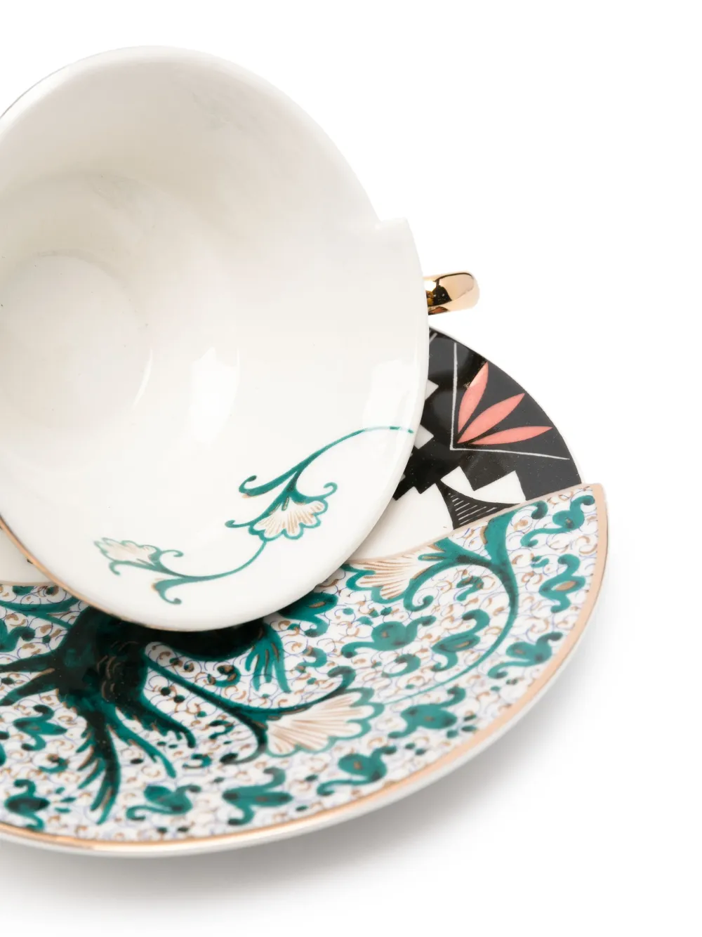 Белый/черный, разноцветный, керамика, глянцевая фактура, цветочный принт, набор из двух предметов, асимметричная форма, дизайн колор-блок, графичный принт спереди, модель круглой формы, асимметричные края, контрастные края, круглая ручка и геометрическая форма.