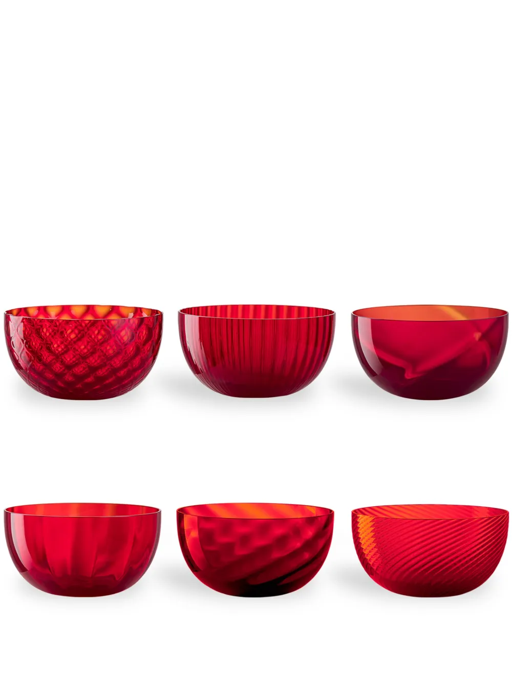 Красный, стекло, фактурная отделка, закругленная форма, прозрачный материал и набор из шести предметов.
