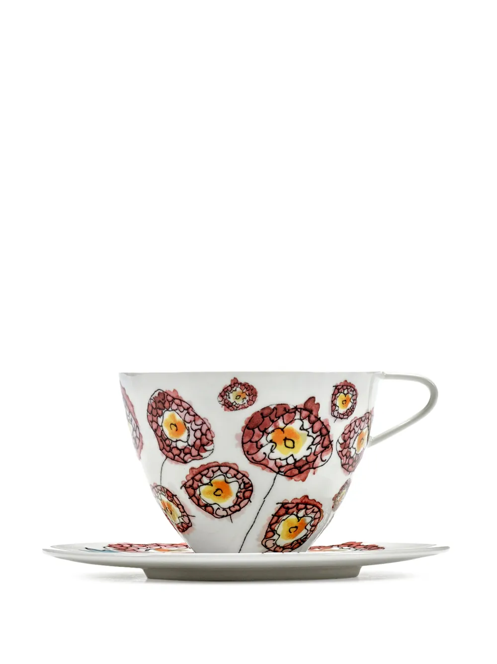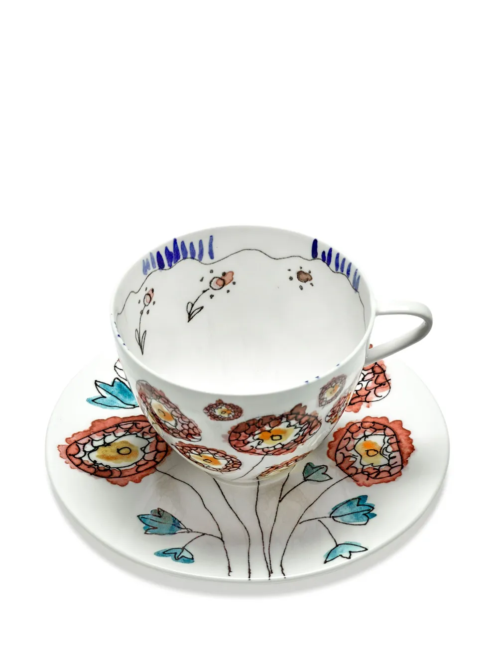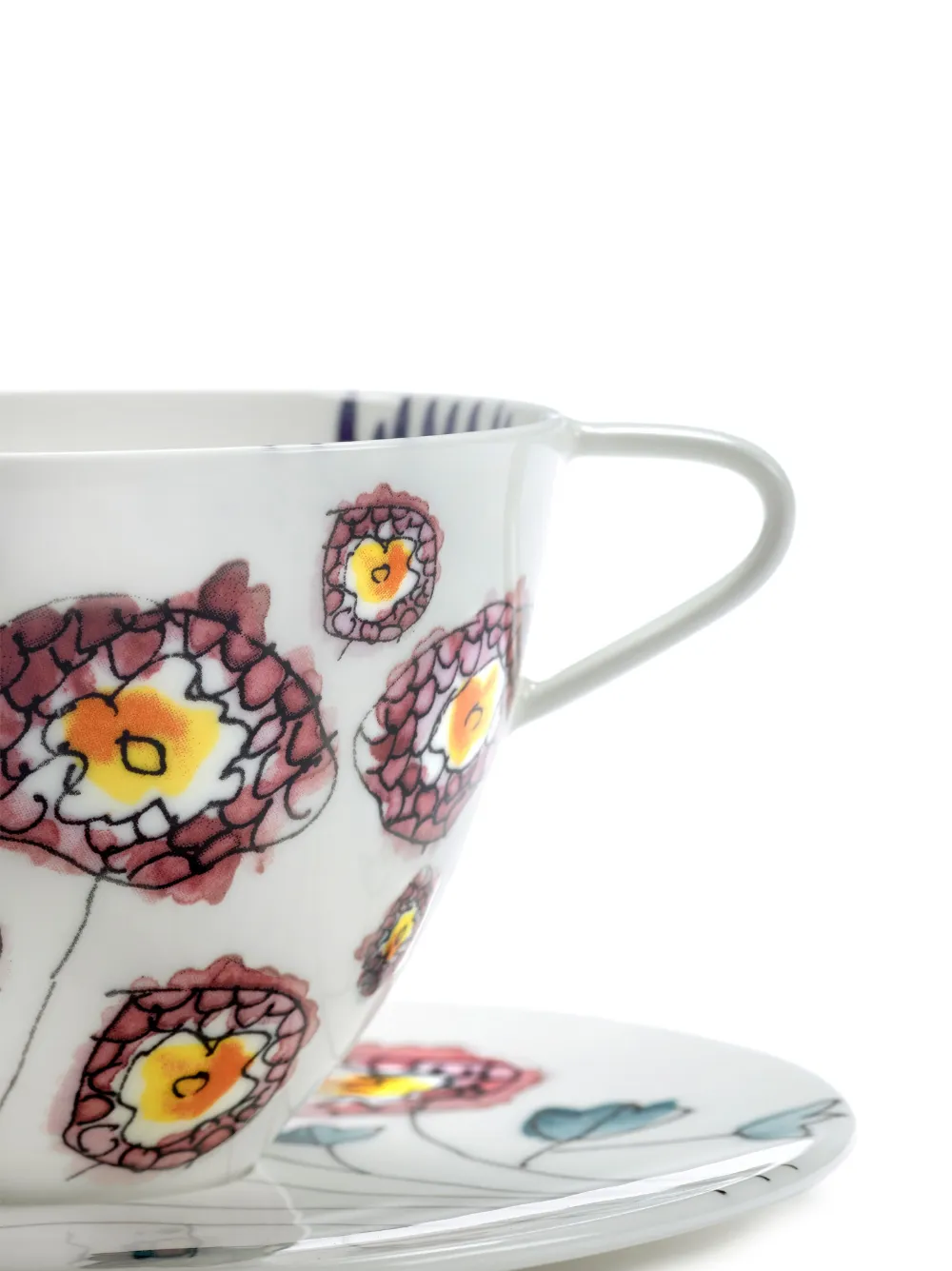 Белый/разноцветный, глазурованное покрытие, цветочный узор, круглая ручка, блюдце в комплементарной расцветке и набор из двух предметов.