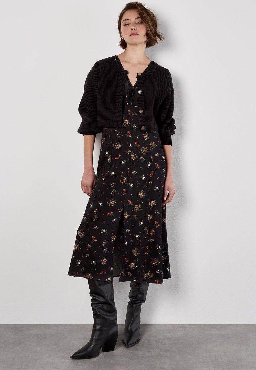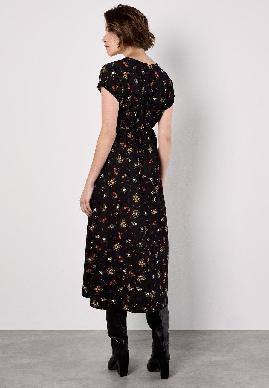 Это легкое и тканое миди-платье, которое обязательно должно быть в вашем гардеробе, сочетает в себе цветочные и сердечные принты и призвано украсить ваш повседневный образ. Платье с V-образным вырезом, отделанным кружевом, и короткими рукавами, имеет застежку на пуговицах, завышенную талию и тканевый пояс, создающий привлекательный силуэт. Платье отделано разрезом спереди на юбке. Вырез горловины: глубокий V-образный. Застежка: пуговицы. Узор: цветочный. Детали: кайма. Материал и уход: 87% вискоза, 13% полиамид. Инструкции по уходу: не отбеливать, не сушить в сушильной машине, машинная стирка при 30 °C. Размер и посадка: рост модели 175 см, размер XS. Посадка: стандартная. Форма: облегающая. Длина: до середины икры. Длина рукава: короткий. Общая длина: 126,5 см (размер XS).Доставка товаров осуществляется курьером или на пункт выдачи заказов.